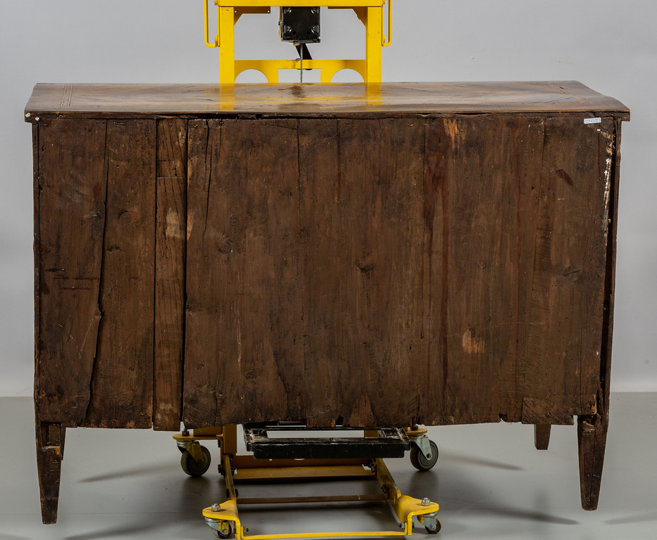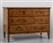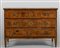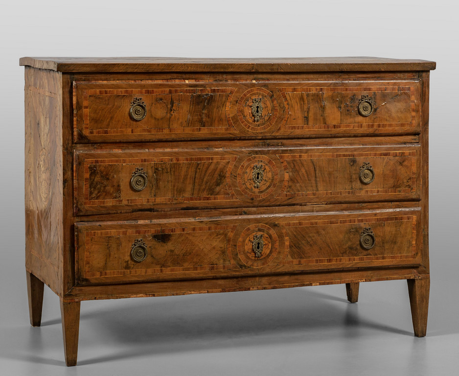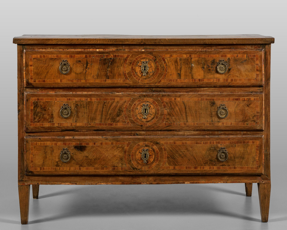 Comò Luigi XVI a tre cassetti lastronato in noce ed intarsiato con filetti e rosoni in legni vari riportati anche sul fianco Emilia II metà sec.XVIII