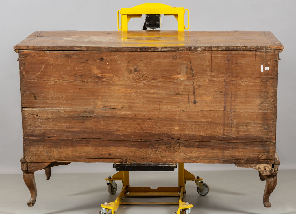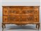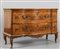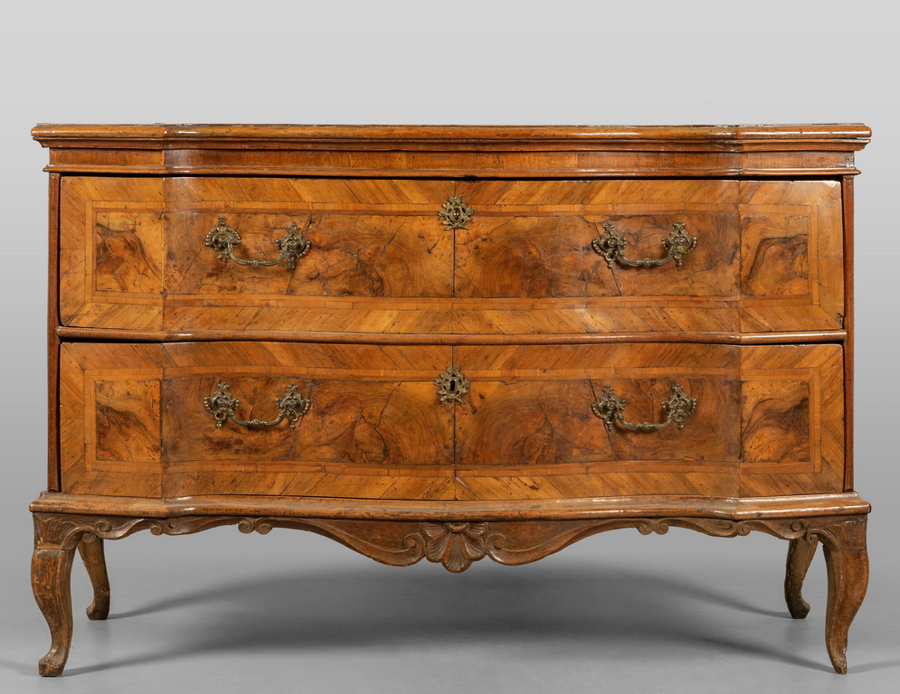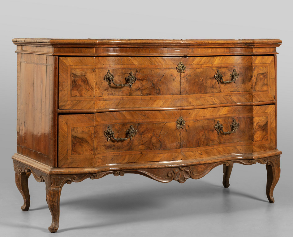 Comò Luigi XIV a due cassetti movimentato sul fronte lastronato in radica con filetti in bois de rose Emilia sec.XVIII