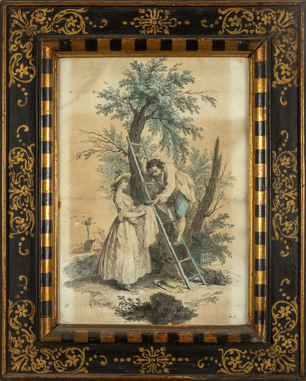'Scena galante' incisione s.ta A.J. cornice del sec.XVII a cassetta laccata nera ed oro
