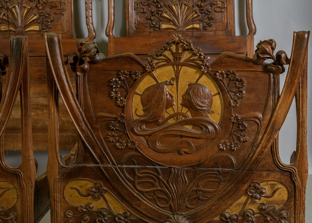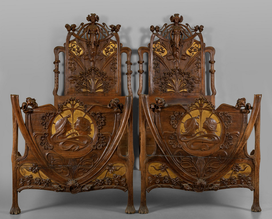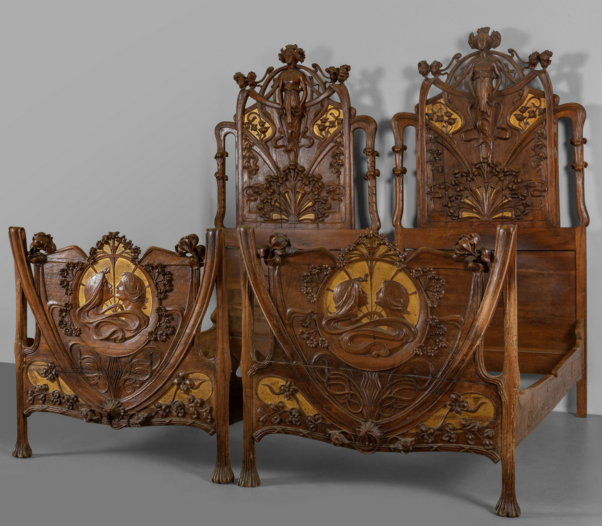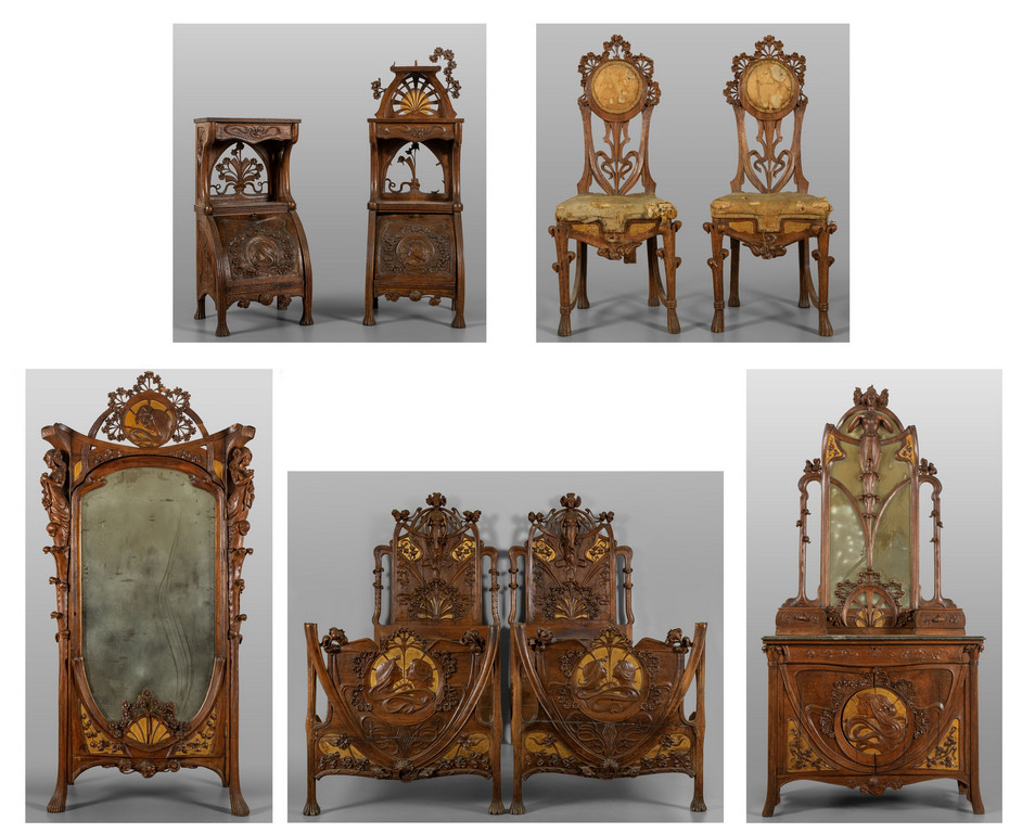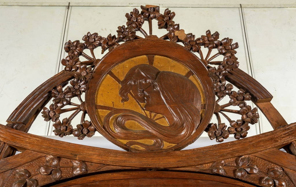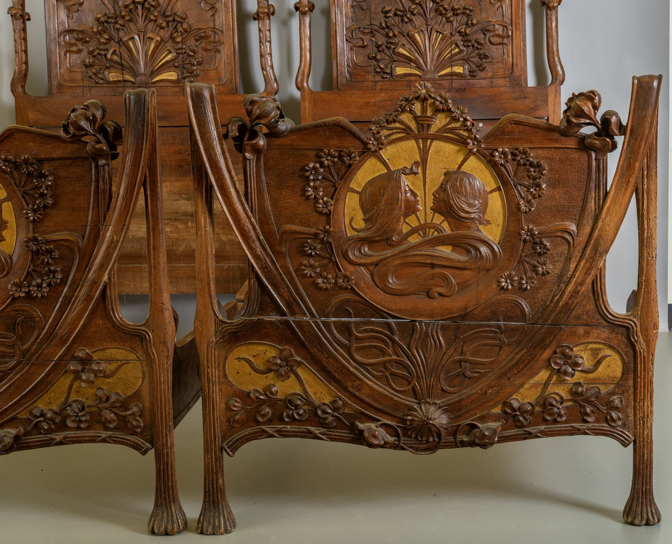 Camera da letto in legno finemente intagliato e dorato con figure femminili composta da due letti (cm.100 x h.205) un comò con specchiera (128 x 60 h.270) un armadio (cm.115x75 h. 240) due comodini (cm.43x25 h. 120) e due sedie attribuita all'ebanista siciliano Ernesto Basile inizi sec. XX (mancanze)