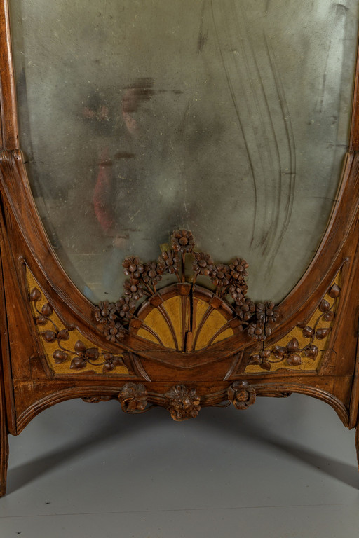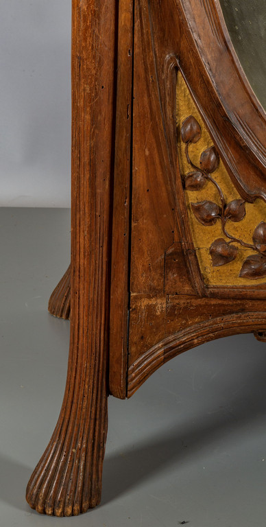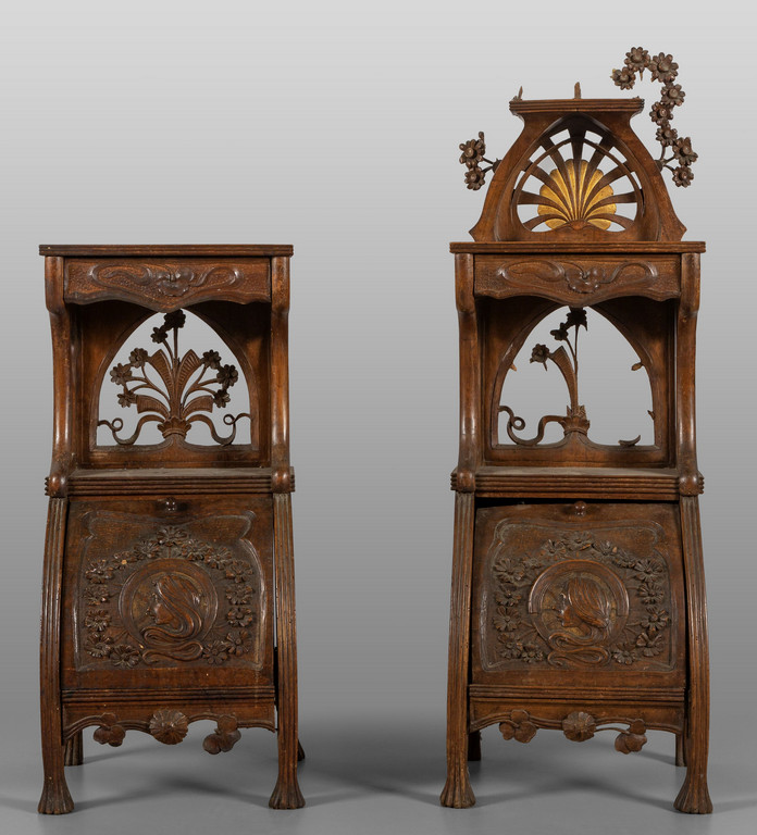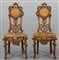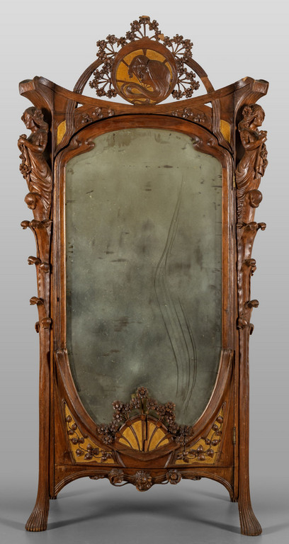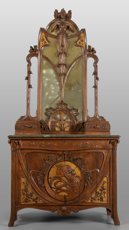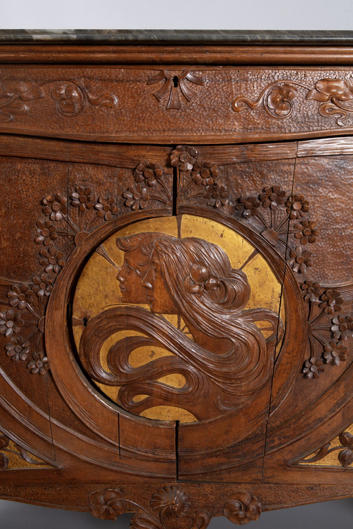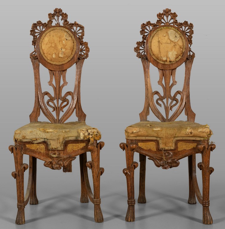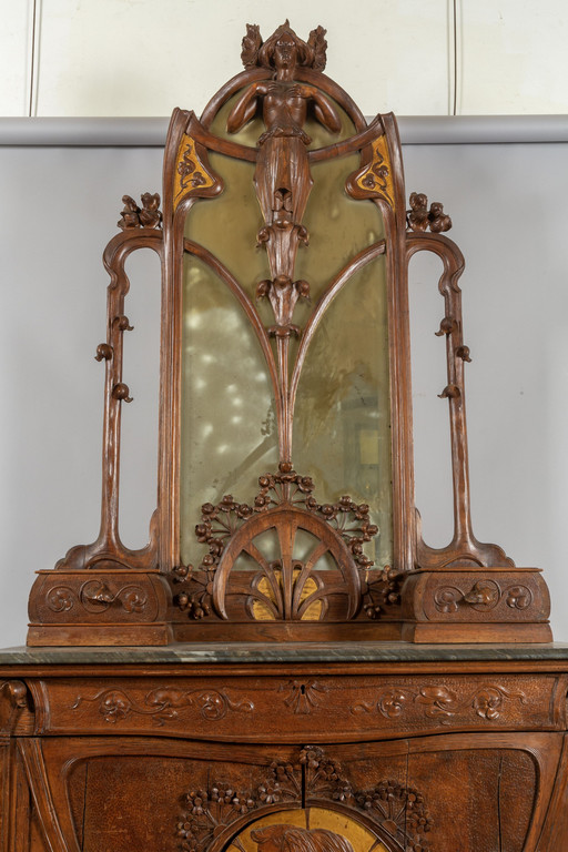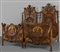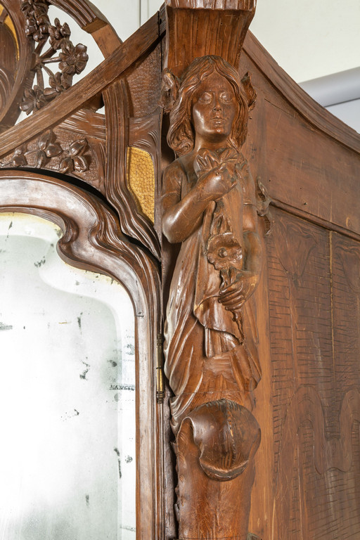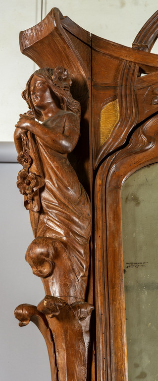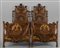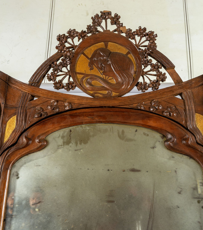 Camera da letto in legno finemente intagliato e dorato con figure femminili composta da due letti (cm.100 x h.205) un comò con specchiera (128 x 60 h.270) un armadio (cm.115x75 h. 240) due comodini (cm.43x25 h. 120) e due sedie attribuita all'ebanista siciliano Ernesto Basile inizi sec. XX (mancanze)