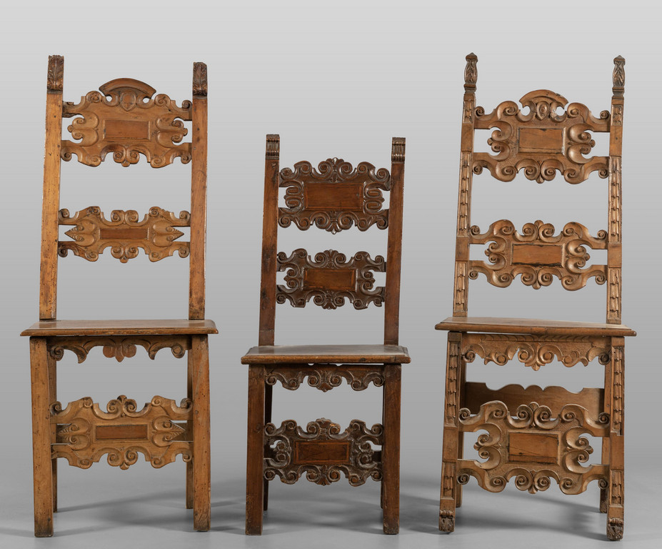 Tre sedie rinascimentali in noce formelle scolpite sec.XVII