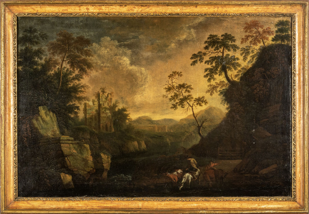 Scuola veneta sec.XVIII 'Paesaggio con figure e rovine' olio