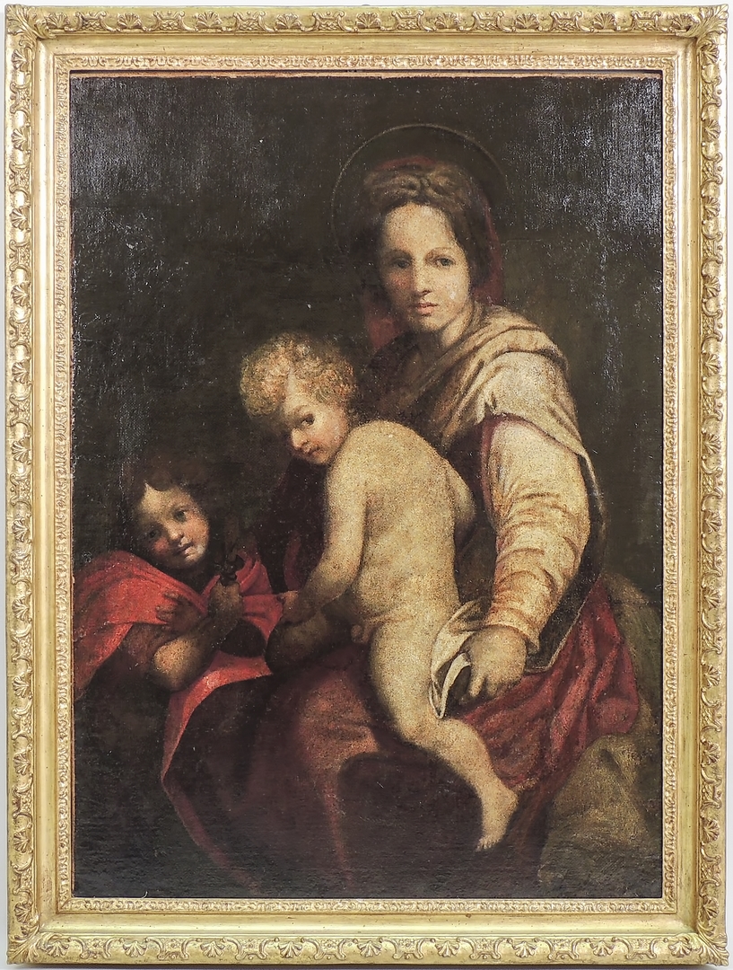 SCUOLA TOSCANA DEL XVII SECOLO - TUSCAN SCHOOL OF 17TH CENTURY Madonna con Bambino e San Giovannino - The Madonna and Child and with Young Saint John olio su tela - oil on canvas, in cornice, restauri cm 99x71