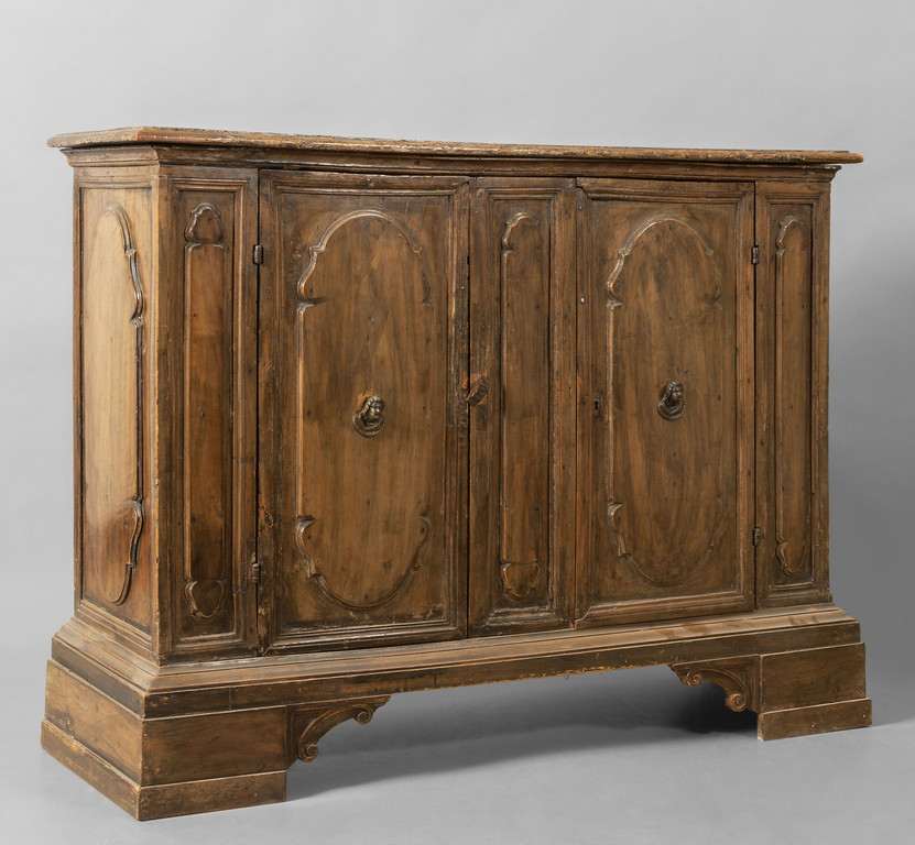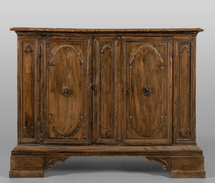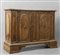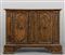 Credenza in noce a due sportelli intagliati con formelle sul fronte elementi antichi