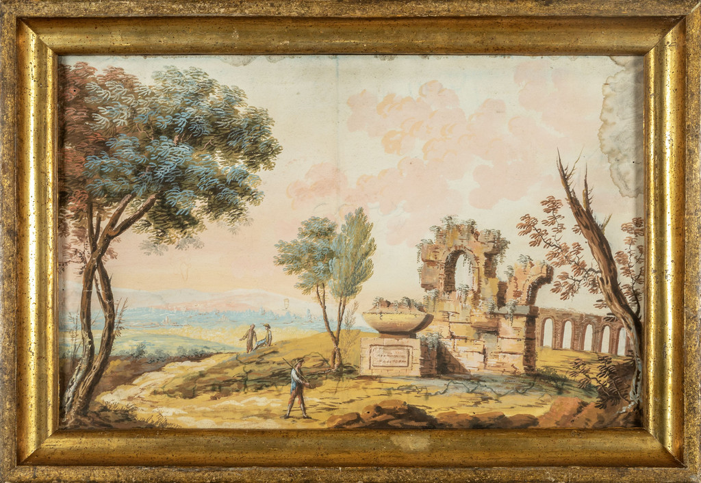 Scuola romana sec.XIX 'Paesaggio con rovine e personaggi' tempera su carta