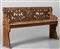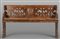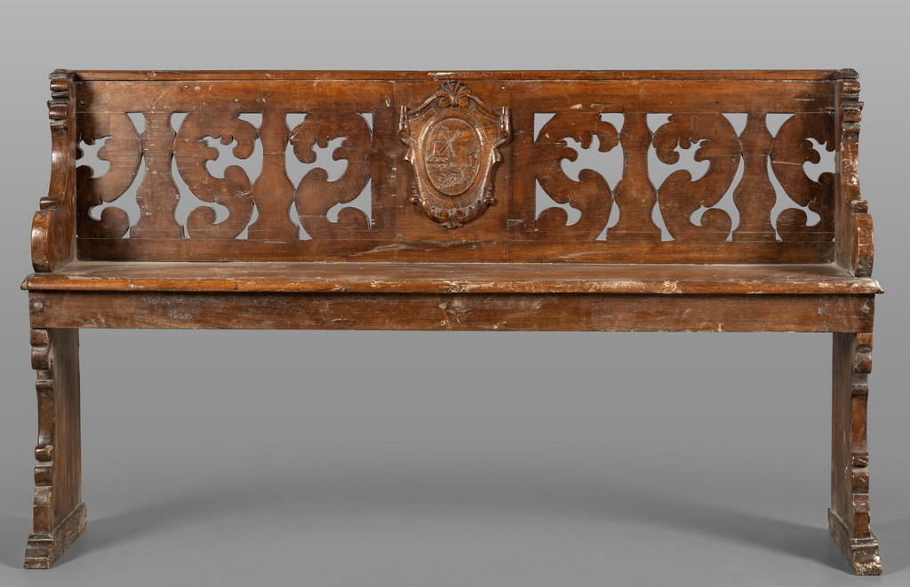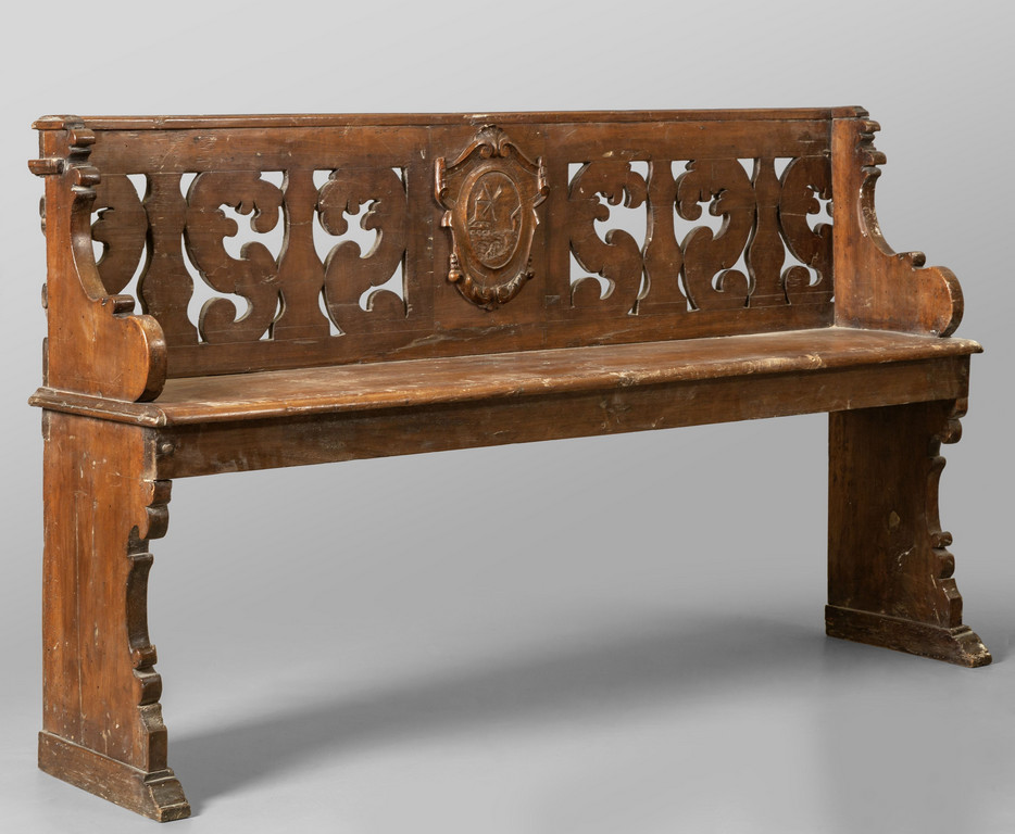 Panca da ingresso in noce schienale traforato con stemma centrale elementi antichi
