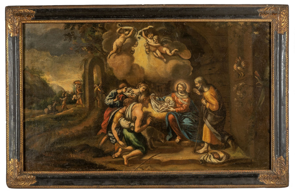 Scuola italiana inizi sec.XVIII 'L'adorazione del Bambino' olio cornice coeva in legno intagliato laccato e dorato