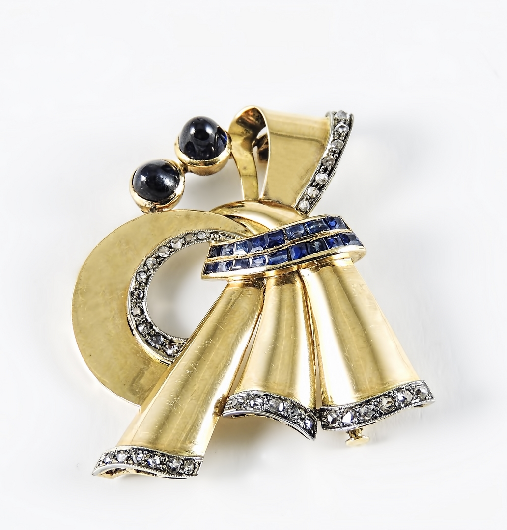 SPILLA IN ORO GIALLO ZAFFIRI E ROSE DIAMANTI - YELLOW GOLD, SAPPHIRE AND DIAMOND BROOCH periodo Decò - Art Deco period realizzata come un nastro stilizzato impreziosito da zaffiri di cui due di taglio cabochon e da rose di diamanti gr 15,4