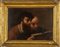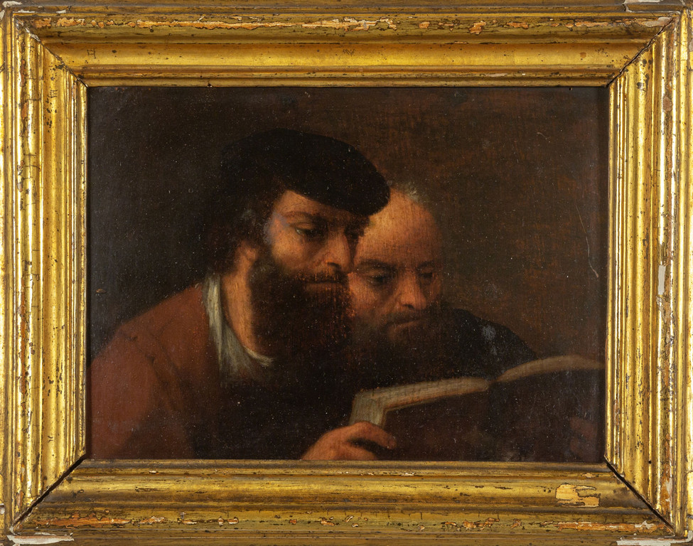 Scuola italiana sec.XVII 'Due personaggi in lettura' olio su tavola cornice coeva in legno intagliato e dorato