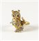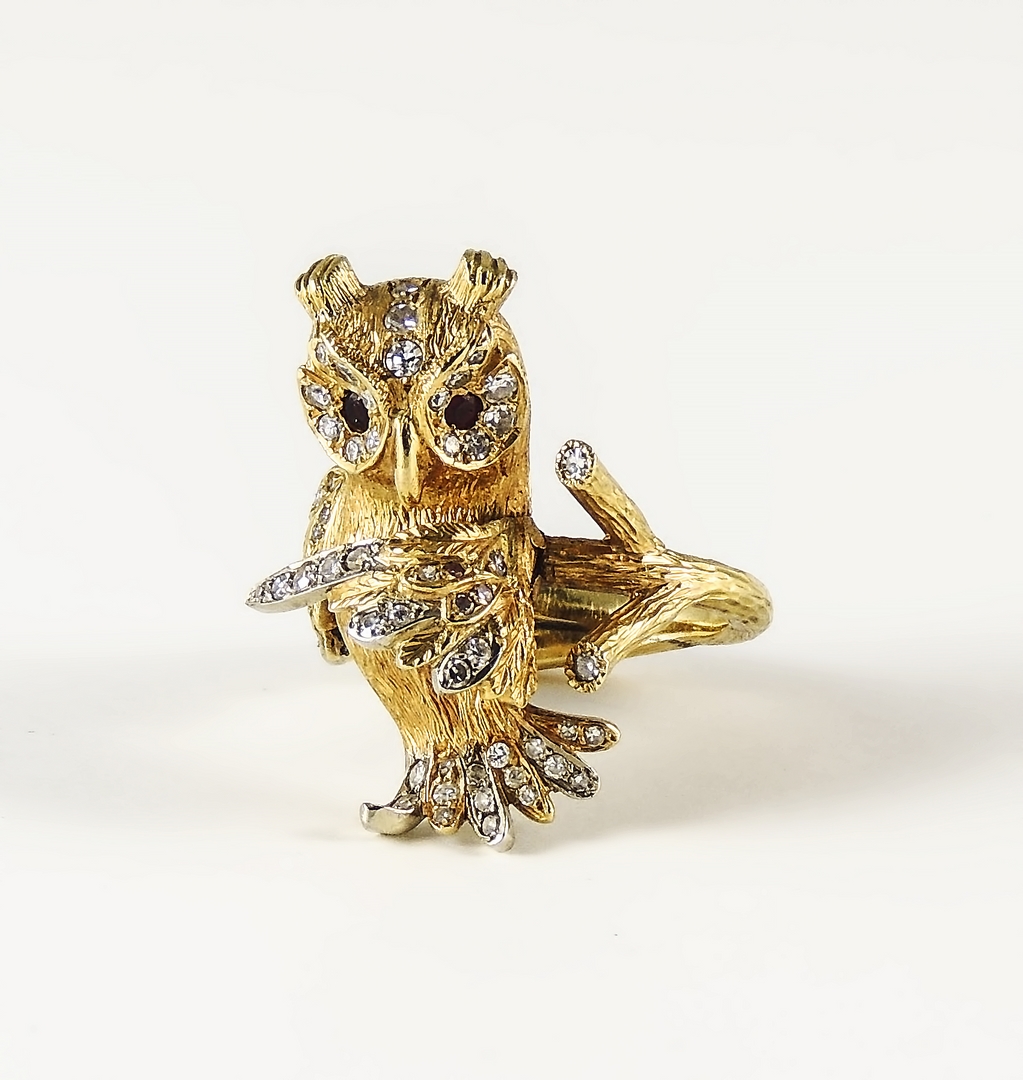 ANELLO IN ORO GIALLO, DIAMANTI E RUBINI - GOLD, DIAMOND AND RUBY RING Anni Cinquanta - the Fifties realizzato come un gufo impreziosito da diamanti taglio brillante, gambo cesellato come un rametto gr 14,1