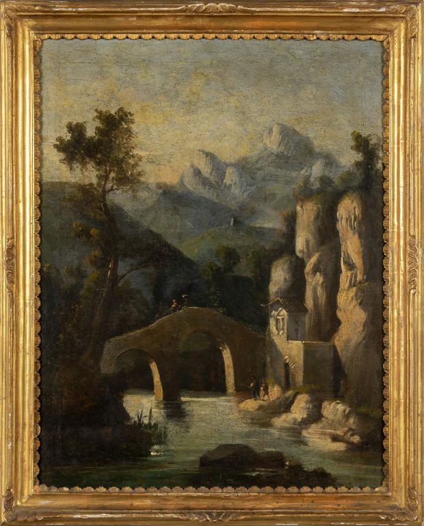 Scuola toscana sec.XVIII 'Il Ponte del diavolo' olio cornice in legno intagliato e dorato coeva
