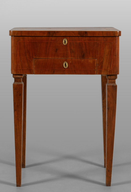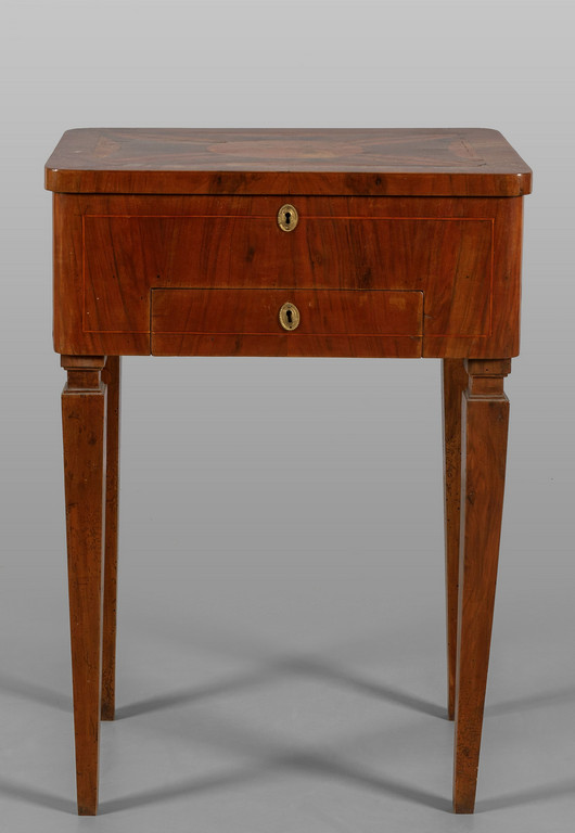 Tavolino da lavoro da centro lastronato in palissandro ed intarsiato in bois de rose un cassetto nella fascia sec.XIX
