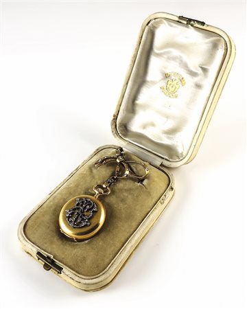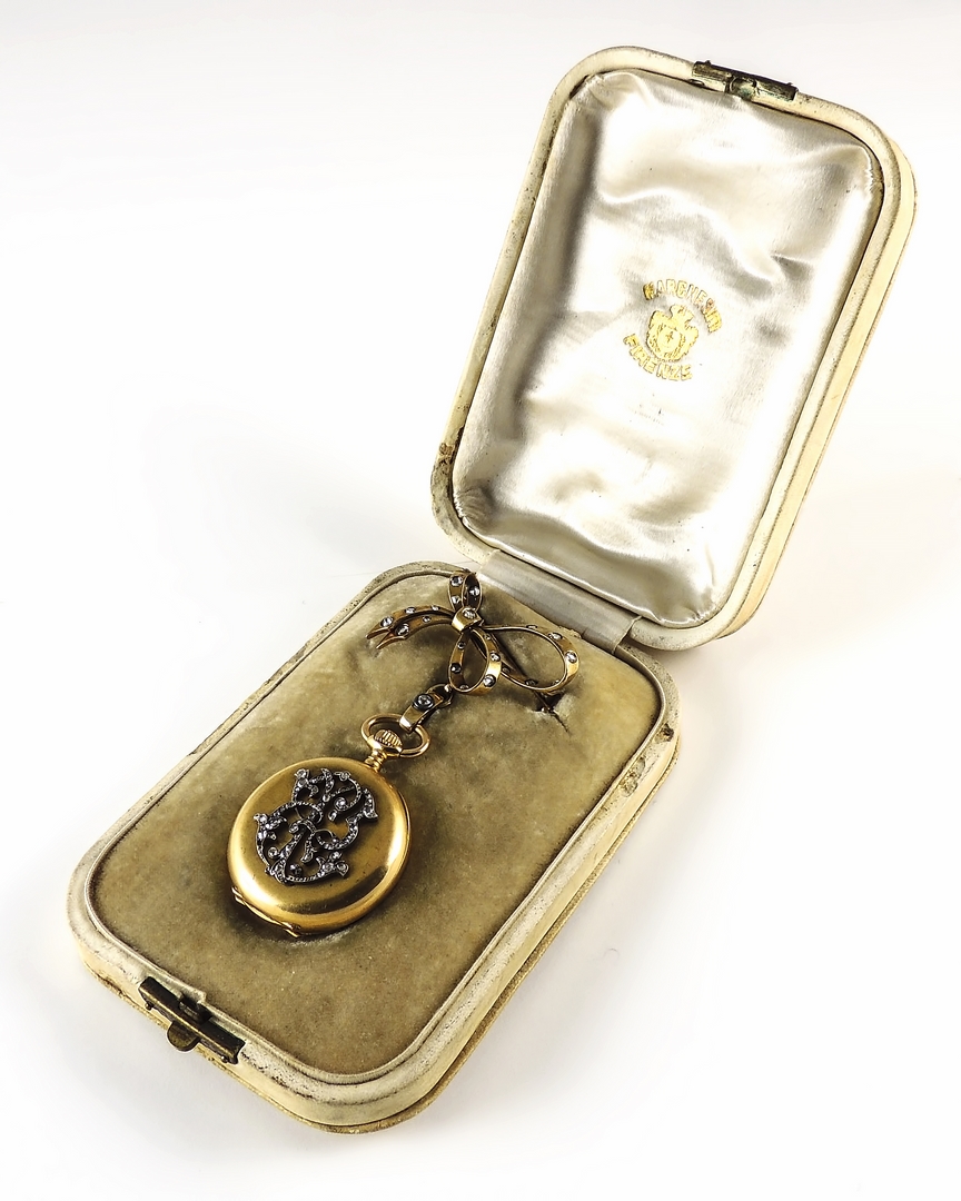 OROLOGIO DA TASCA IN ORO - GOLD POCKET WATCH Geneve, Eugene Bornand & Cie S.te Croix, fine del XIX secolo - late 19th Century doppia cassa impreziosita da monogramma in diamanti EP, con spilla a fiocco, entro astuccio originale in pelle bianca con monogramma in argento, marcato all'interno "Marchesini Firenze"