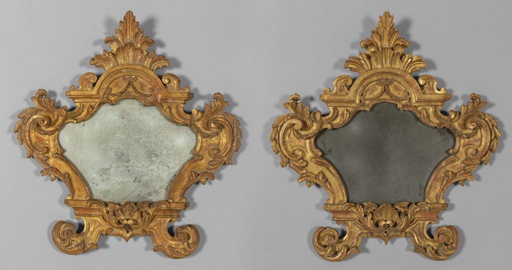 Coppia di grandi cantagloria Luigi XV in legno intagliato e dorato con specchi sec.XVIII