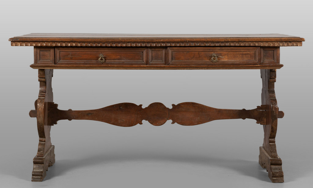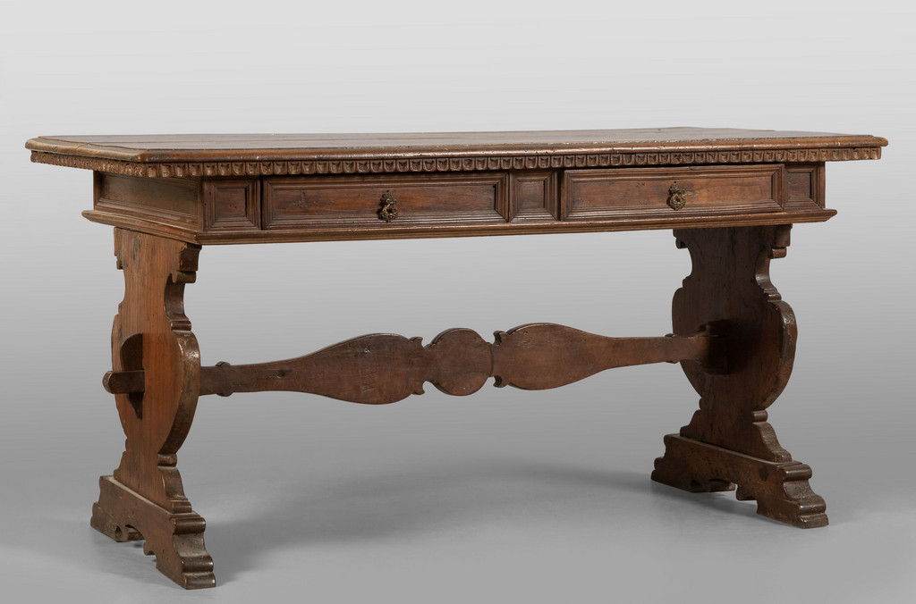 Tavolo scrittoio in noce gambe ad asso di coppe unite da traverse elementi antichi