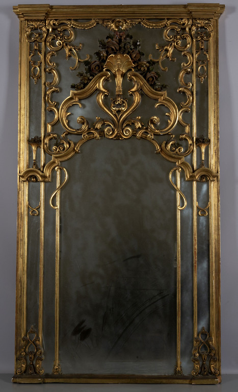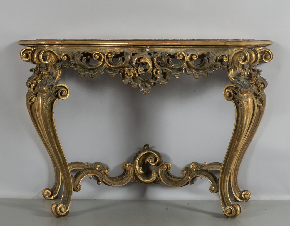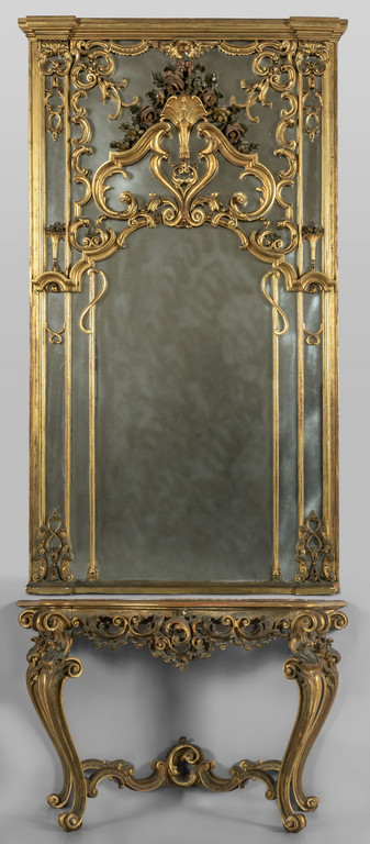 Console con specchiera in stile Luigi XV in legno intagliato dorato e laccato piano in marmo Piemonte sec.XIX