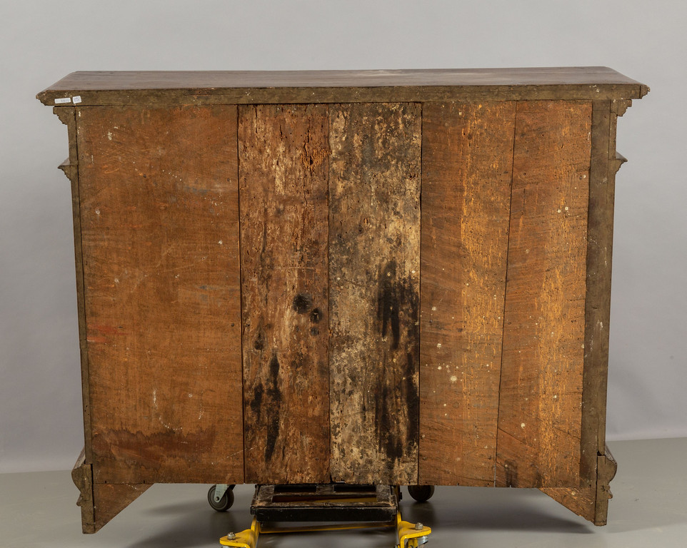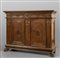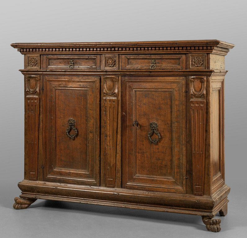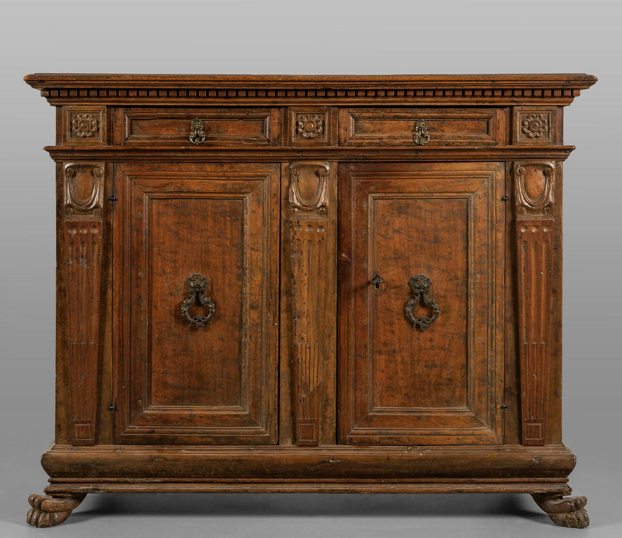 Credenza in noce in stile rinascimentale a due cassetti e due sportelli sul fronte montanti intagliati