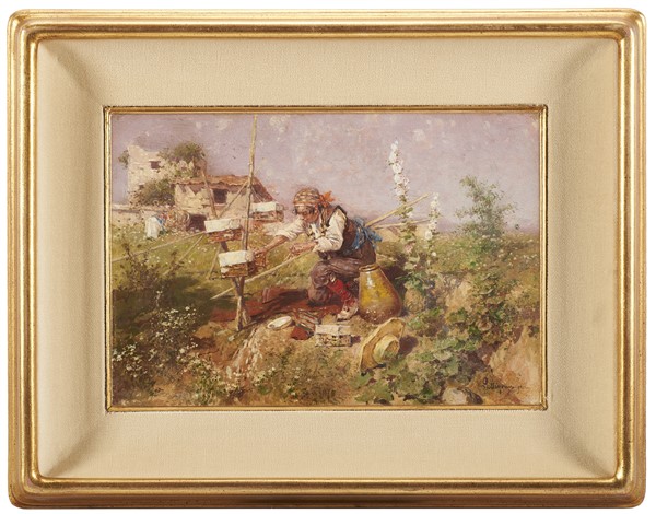 Riccardo Pellegrini "La raccolta del miele" 1892 olio su tela (cm 20x30) Firmato