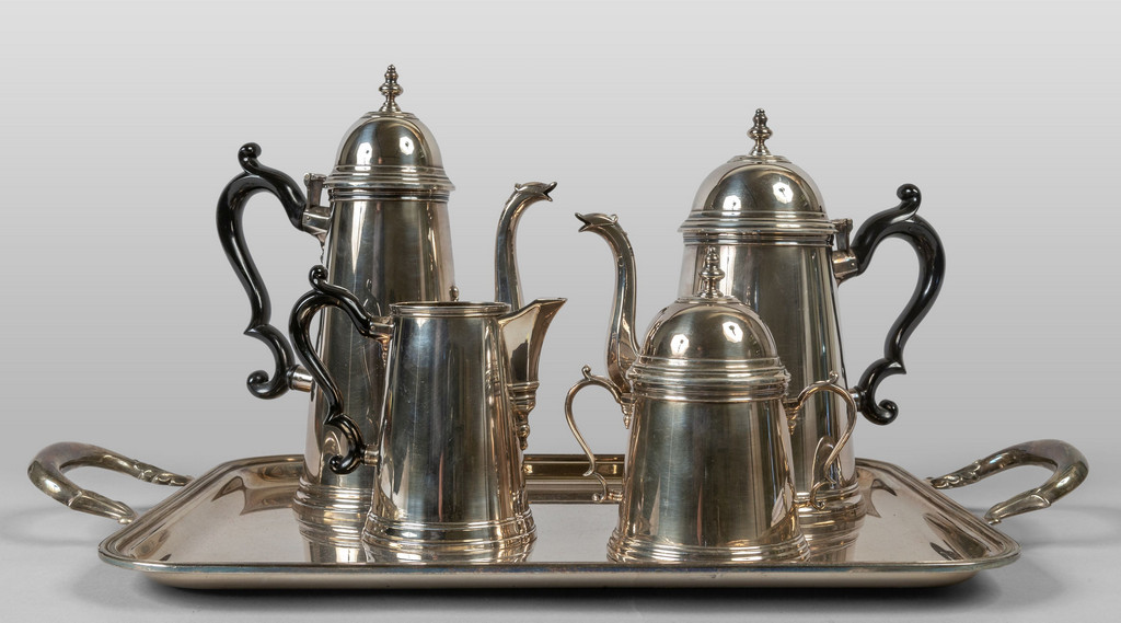 Servizio da thè e caffè in argento con manico in legno e vassoio con manici