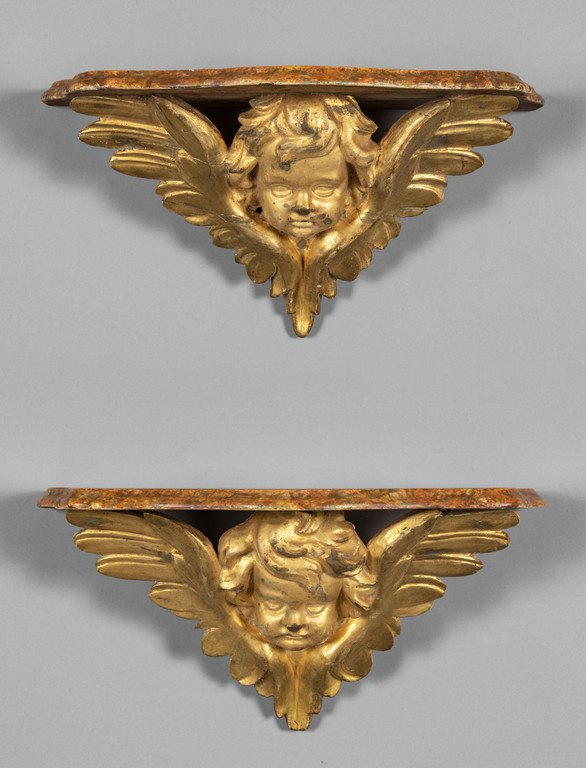 Coppia di mensoline in legno intagliato e laccato sorrette da angioletti alati in legno dorato