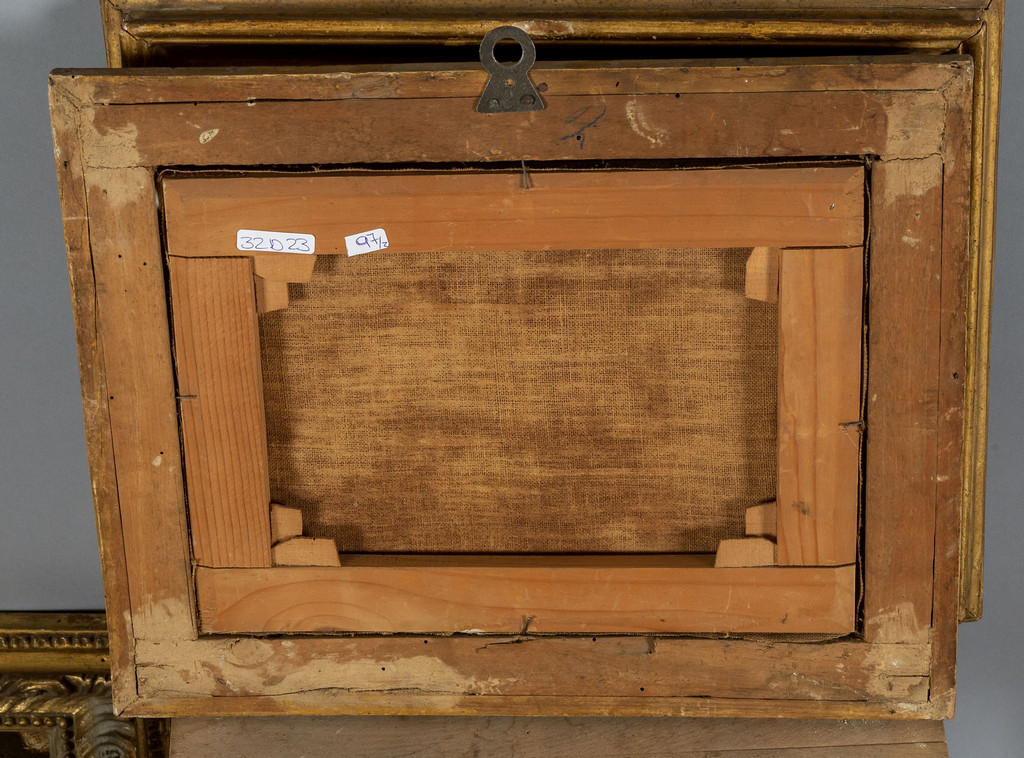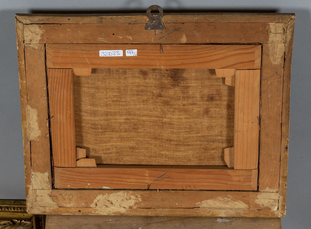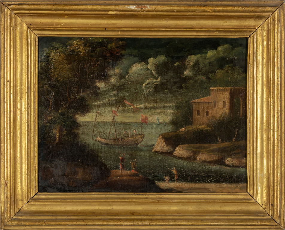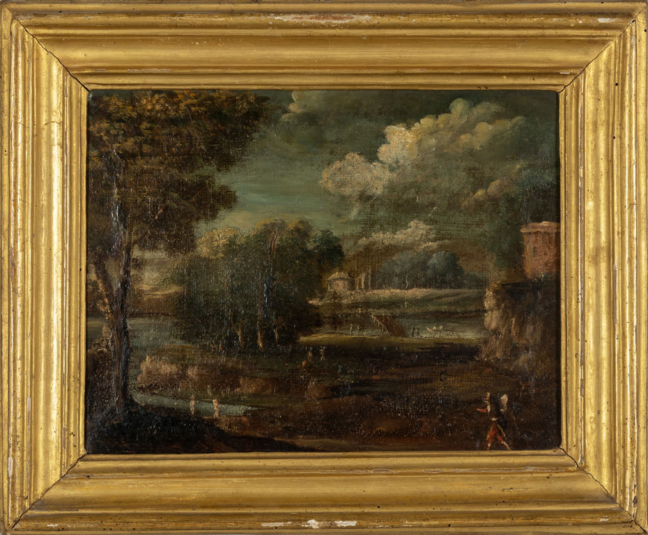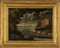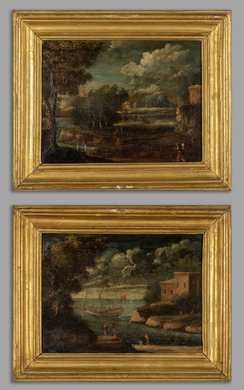 Scuola italiana sec.XVIII 'Paesaggi animati con figure' coppia di olii cornici coeve in legno intagliato e dorato
