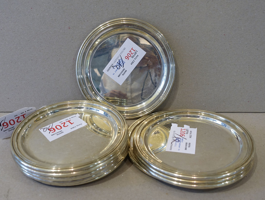 Precedente Lotto 1206 Successivo Aste Boetto - Via Mura dello Zerbino 10R, 16122 Genova ASTA DI ANTIQUARIATO Asta di Antiquariato giovedì 22 giugno 2023 ore 10:00 (UTC +01:00) OGGETTISTICA Dodici sottobicchieri in argentodiam.cm.12 5 gr.970