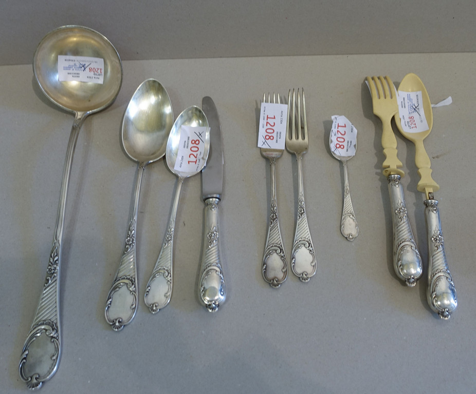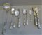 Servizio di posate in argento composto da: 10 cucchiai grandi 20 forchette grandi 21 coltelli grandi 9 coltelli piccoli 7 forchette piccole 11 cucchiai dolce 12 cucchiaini mestolo due posate da portata e 1 pinzetta