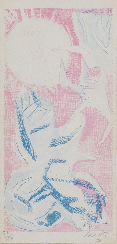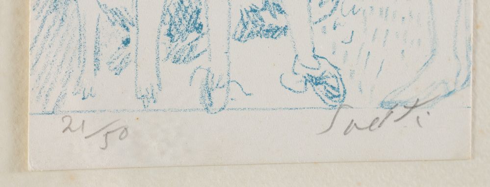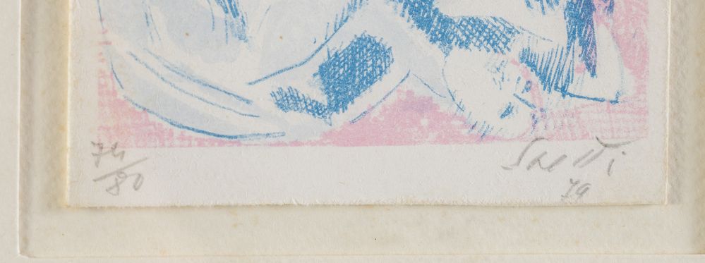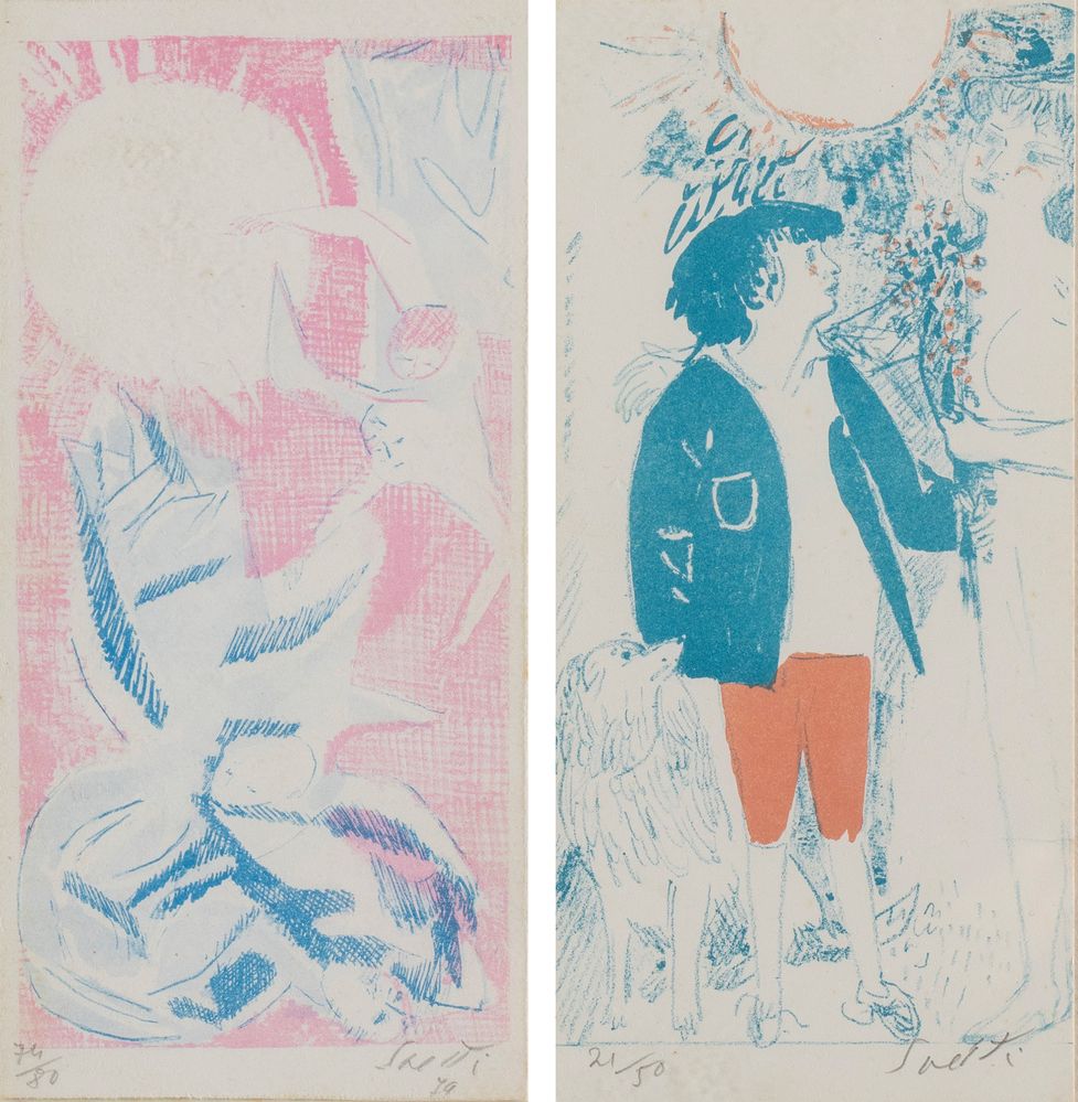 BRUNO SAETTI (Bologna 1902 – 1984) Coppia di litografie a colori su carta. Cadauna di cm 22,3x10,2. Opere firmate in basso a destra Saetti. La prima litografia reca data in basso a destra '79 e numeri di tiratura in basso a sinistra 74/80. La seconda litografia reca numeri di tiratura in basso a sinistra 21/50.