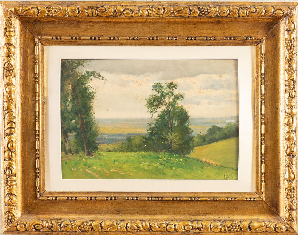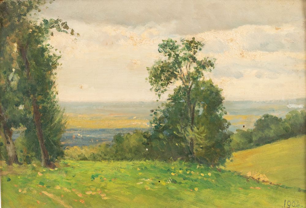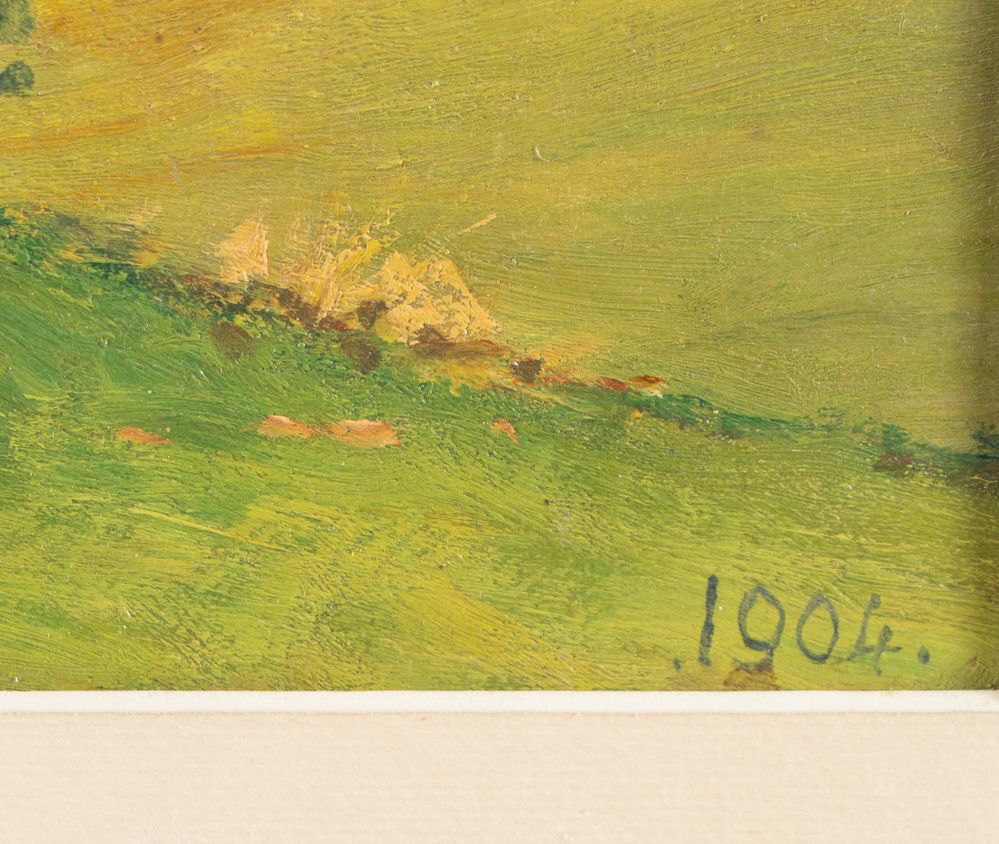 Pittore anonimo dell'inizio del XX secolo. "Paesaggio", 1904. Olio su tavola. Cm 26x36. Opera datata in basso a destra 1904.