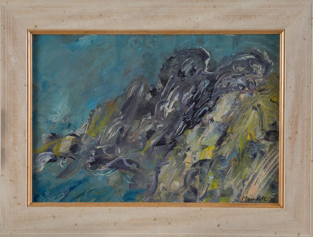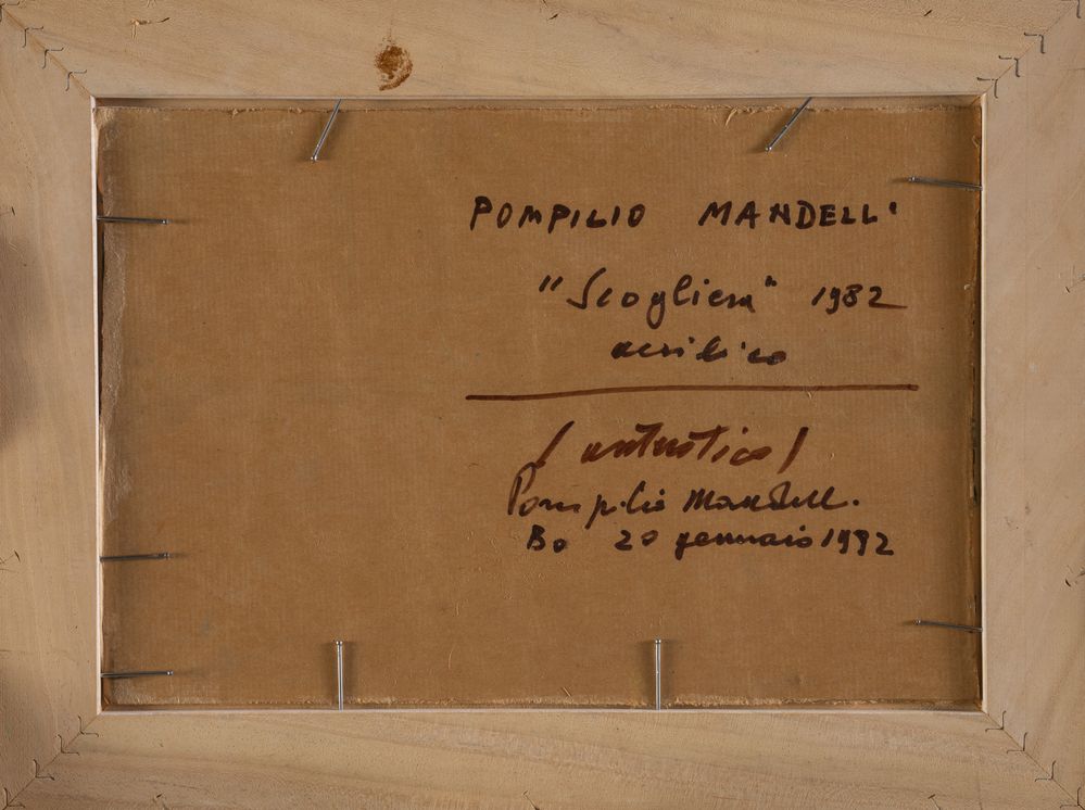 POMPILIO MANDELLI (Luzzara 1912 – Bologna 2006) "Scogliera", 1982. Acrilico su tavola. Cm 22,5x32,5. Opera firmata e datata in basso a destra Mandelli '82. Al retro opera firmata, intitolata e datata Pompilio Mandelli, Scogliera, 1982. Al retro reca firma per autentica.