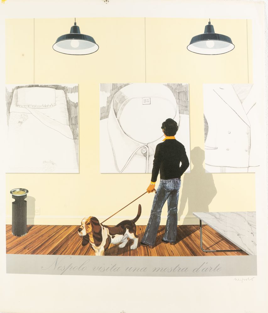 UGO NESPOLO (Mosso 1941) "Nespolo visita una mostra d'arte". Litografia a...