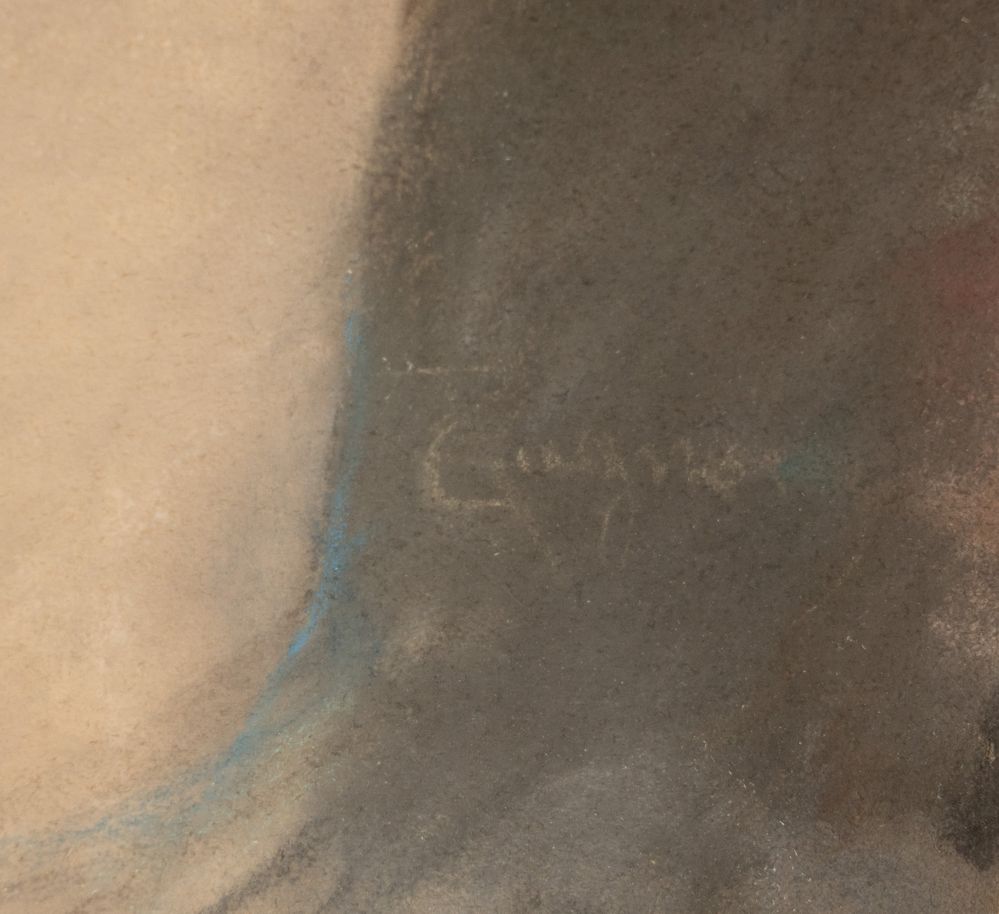 "Il piccolo belga". Pastello su cartoncino. Cm 48x40. Opera firmata in basso a destra Cagnoni. Al retro reca antico cartellino con riferimenti all'opera e all'autore; frammento di antico cartellino con numero di riferimento e antico cartellino con nome dell'artista e numero di riferimento.