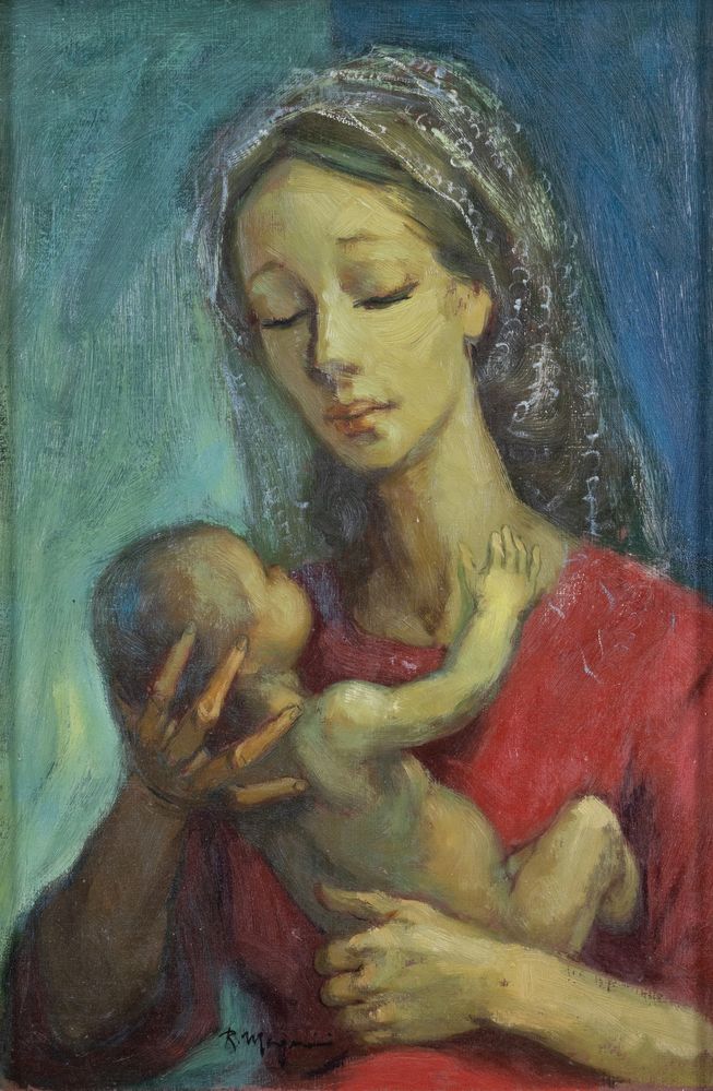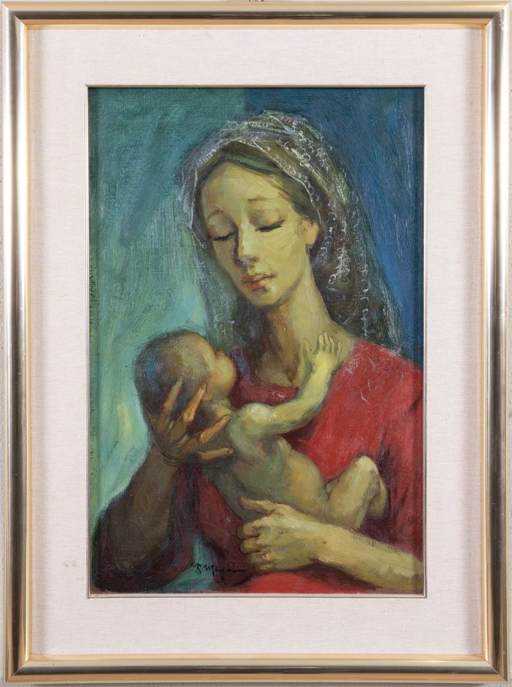 RENZO MAGNANINI (Gonzaga 1920 – Bentivoglio 2006) "Donna con bambino". Olio su tela. Cm 58,5x38,5. Opera firmata in basso al centro R. Magnanini.