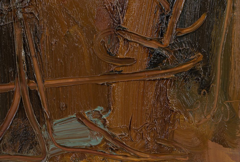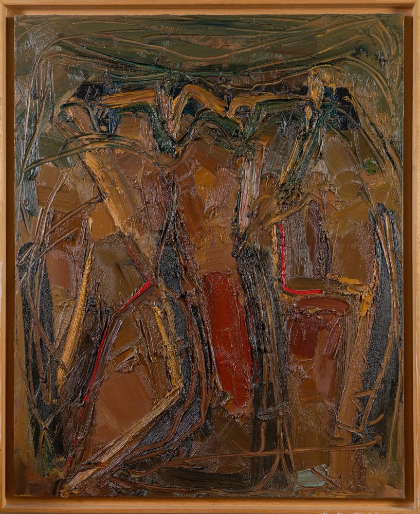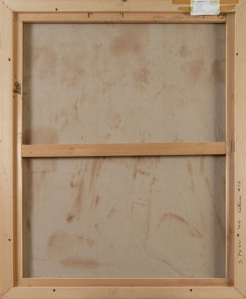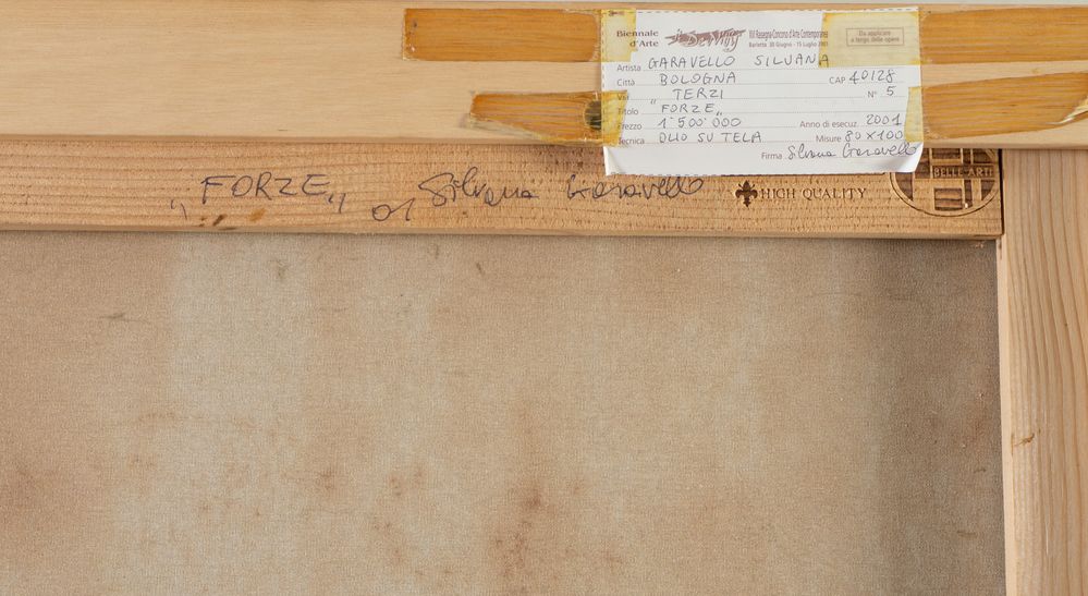 SILVANA GARAVELLO (Bologna 1954) "Forze", 2001. Olio su tela. Cm 100x80. Opera firmata in basso a destra Garavello. Al retro reca etichetta della XVI Rassegna - Concorso d'Arte Contemporanea, Barletta.
