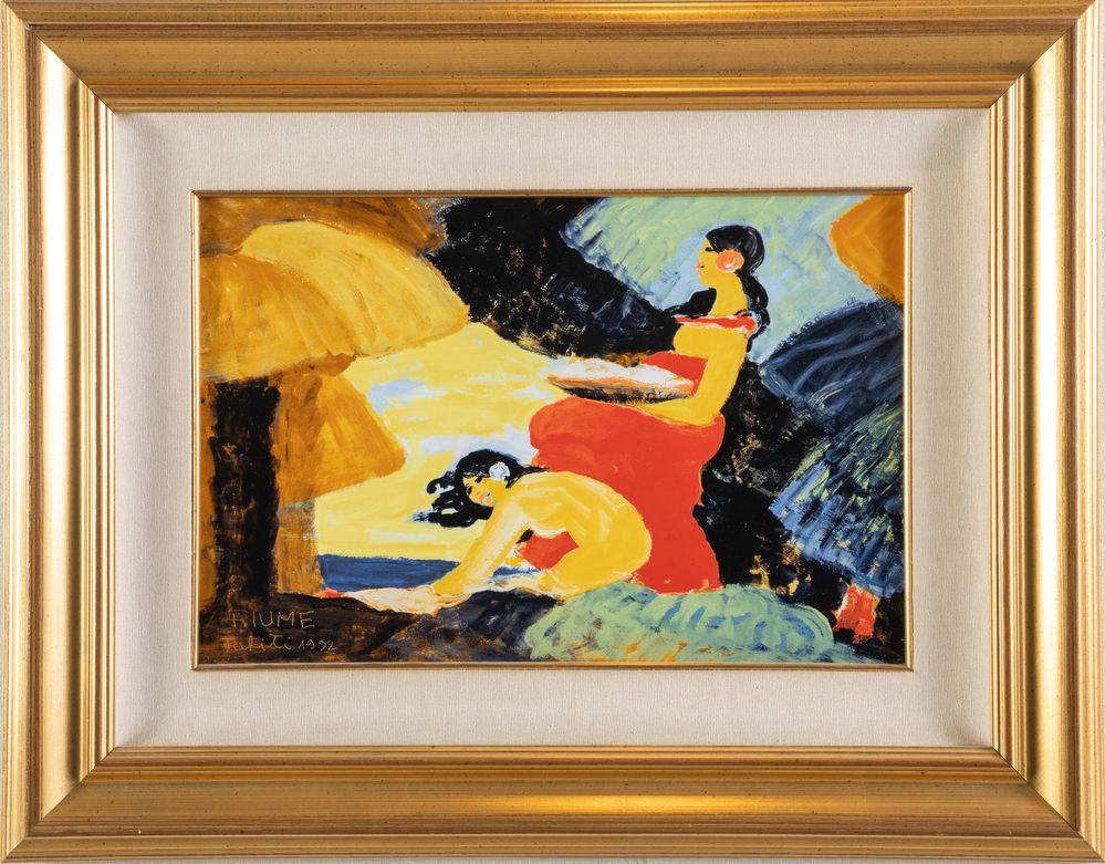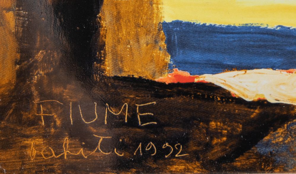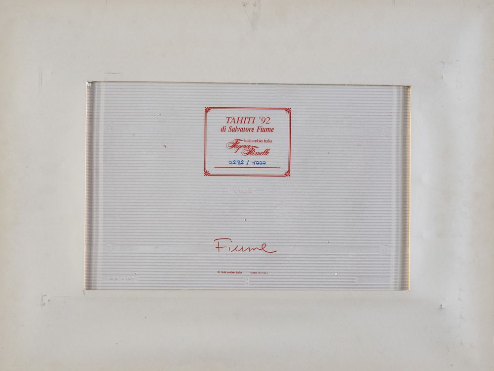 SALVATORE FIUME (Comiso 1915 – Milano 1997) "Tahiti", 1992. Formella in ceramica policroma. Cm 29x44. Al retro reca numeri di tiratura 292/1000. Produzione Fayence Formelle.