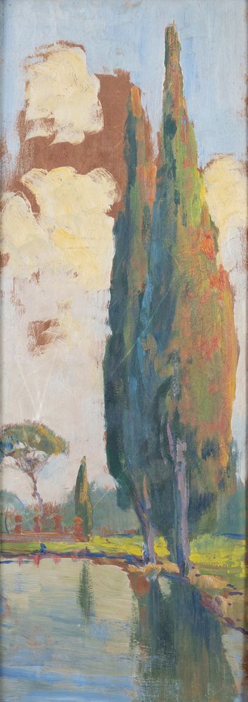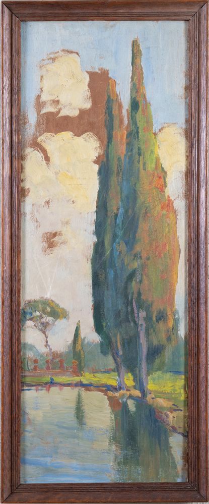 Pittore anonimo dell'inizio del XX secolo. "Il lago a Villa Falconieri, Frascati", 1935. Olio su faesite. Cm 53x19. Al retro opera firmata, datata e intitolata.