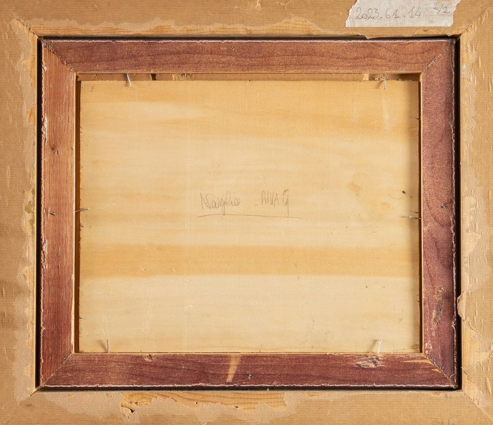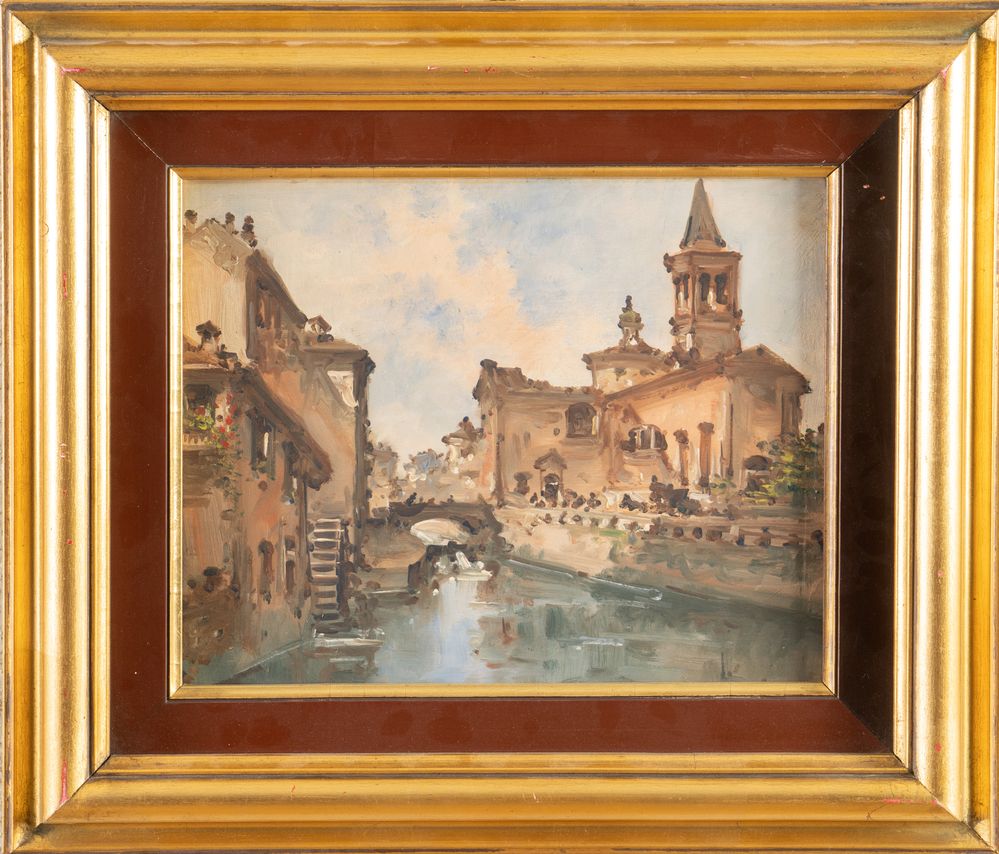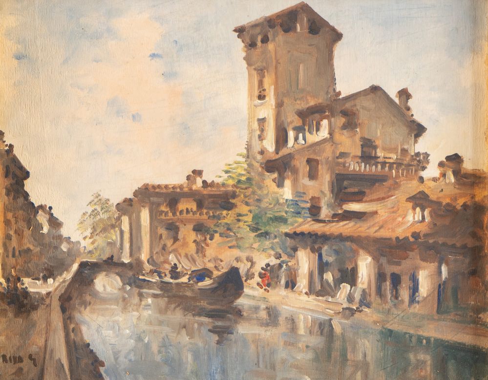 GIOVANNI RIVA (Torino 1890 – 1973) "Vedute dei Navigli". Coppia di dipinti, entrambi olio su tavola. Cm 24x30. Opere firmate in basso a sinistra Riva G. Al retro opere firmate e intitolate Naviglio, Riva G.