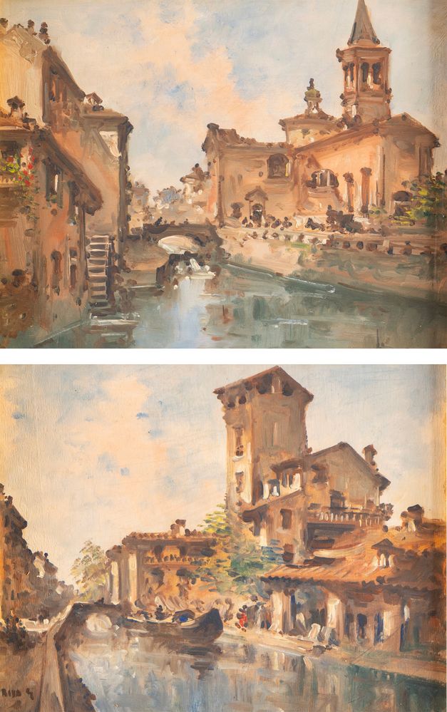 GIOVANNI RIVA (Torino 1890 – 1973) "Vedute dei Navigli". Coppia di dipinti,...
