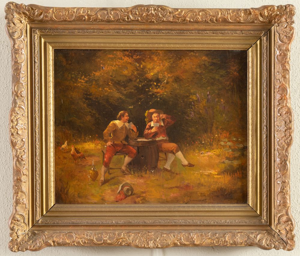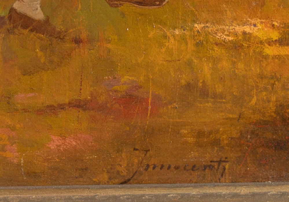 GUGLIELMO INNOCENTI (1871 – 1961) "Giocatori di carte in un paesaggio". Olio su tela. Cm 33x41. Opera firmata in basso a destra Innocenti.