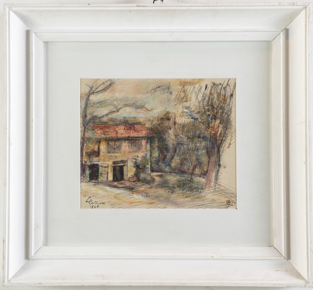 LEA COLLIVA (Bologna 1901 – 1975) "Paesaggio", 1943. Tecnica mista su carta. Cm 24,5x30. Opera firmata e datata in basso a sinistra L. Colliva 1948.