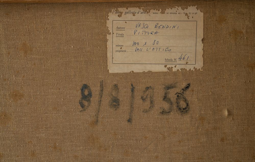 Al retro opera firmata e datata 8/8/1956, Vasco Bendini. Al retro reca etichetta L'Attico Galleria d'Arte, Roma, con numero 461.