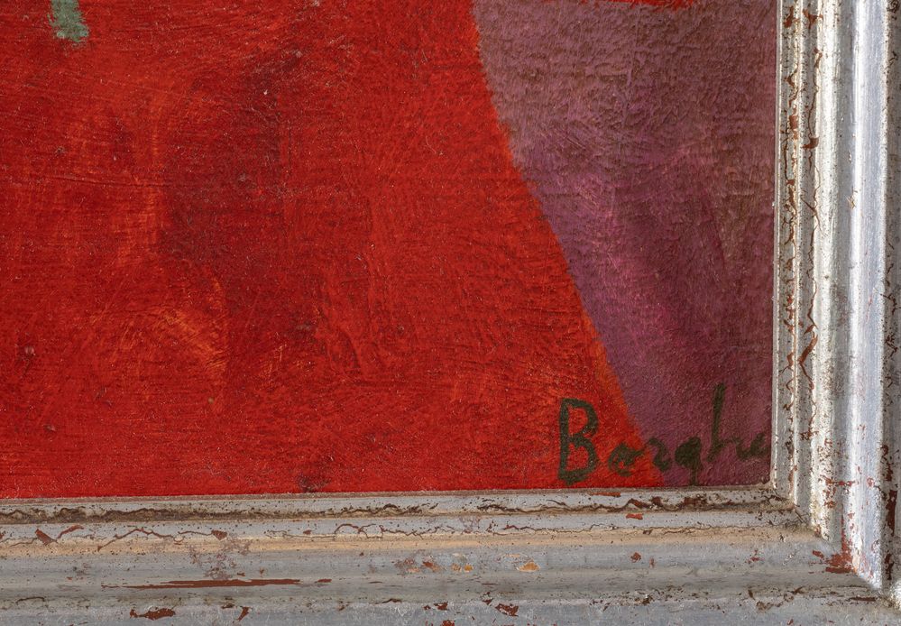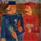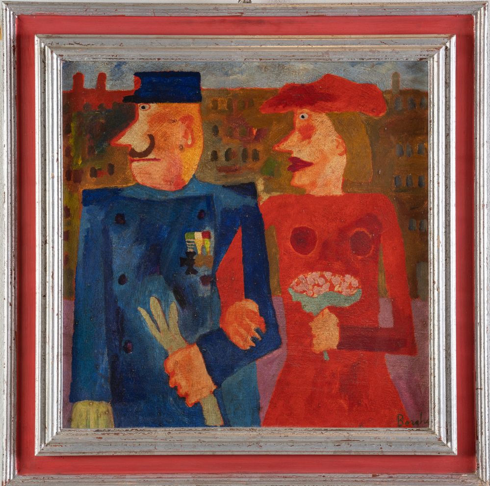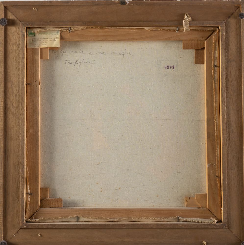 FRANZ BORGHESE (Roma 1941 – 2005) "Il generale e sua moglie", 1972. Olio su tela. Cm 50x50. Opera firmata in basso a destra Borghese. Al retro opera firmata e intitolrata Franz Borghese, Il generale e sua moglie. Al retro reca timbro della Gallerai d'Arte Moderna Viotti, Torino, con numero 4878. Al retro reca etichetta della Galleria d'Arte Moderna Viotti, Torino.