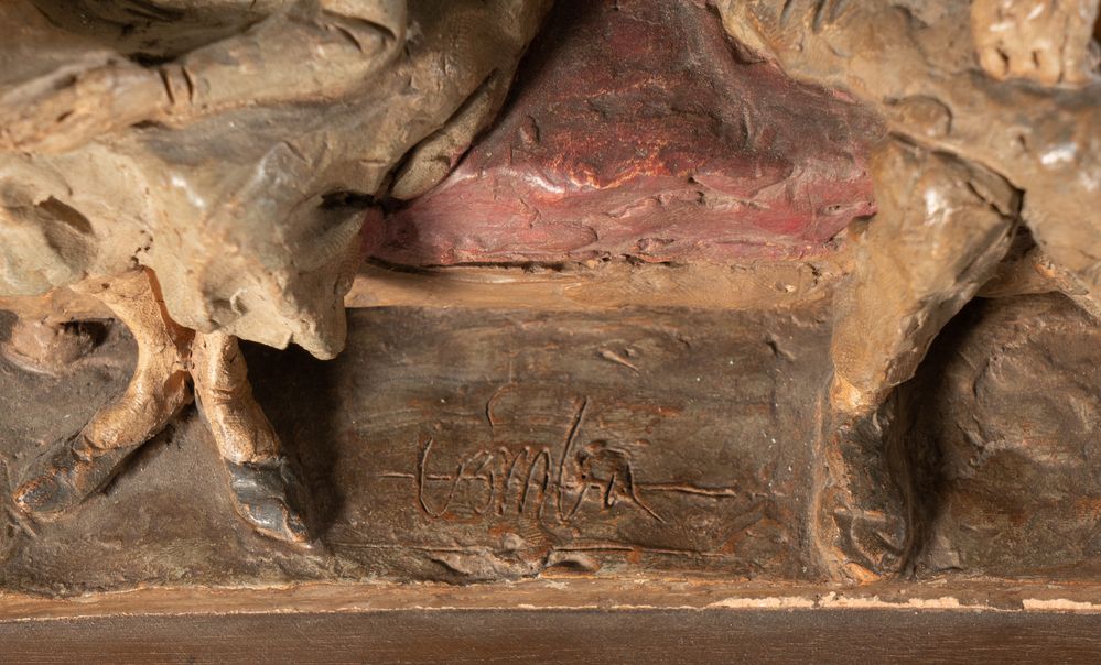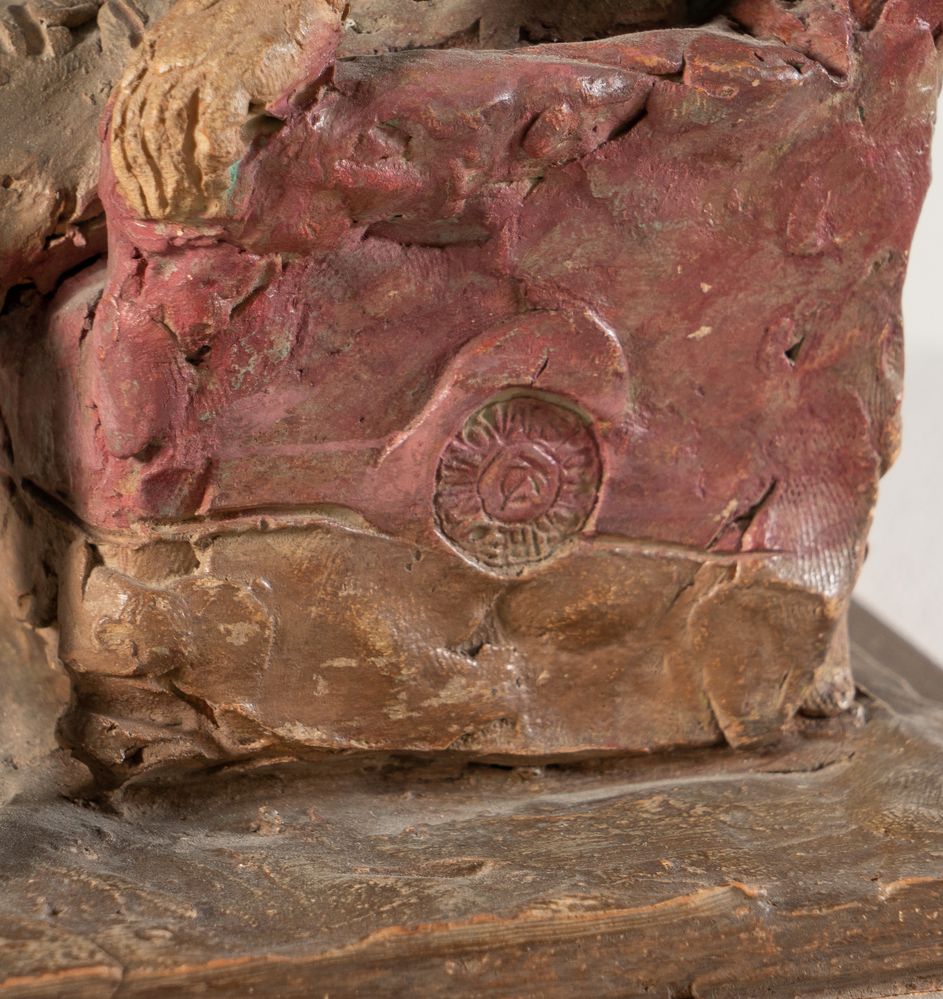 CLETO TOMBA (Castel San Pietro Terme 1898 - Bologna 1987) "Gli Artisti", anni '40. Scultura in terracotta policroma. Cm 21x31x11,5. Opera firmata alla base Tomba. A lato reca timbro CT. Pubblicazioni: L. Bertacchini (a cura di), Cleto Tomba, 2001, p.75.
