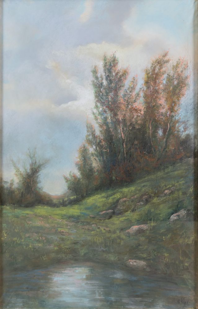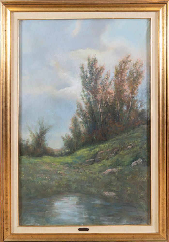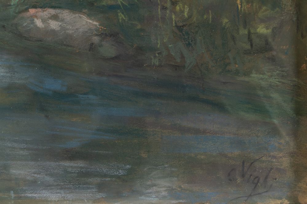 CORIOLANO VIGHI (Firenze 1846 – Bologna 1905) "Paesaggio". Tecnica mista su carta. Cm 123,5x78,5. Opera firmata in basso a destra C. Vighi.