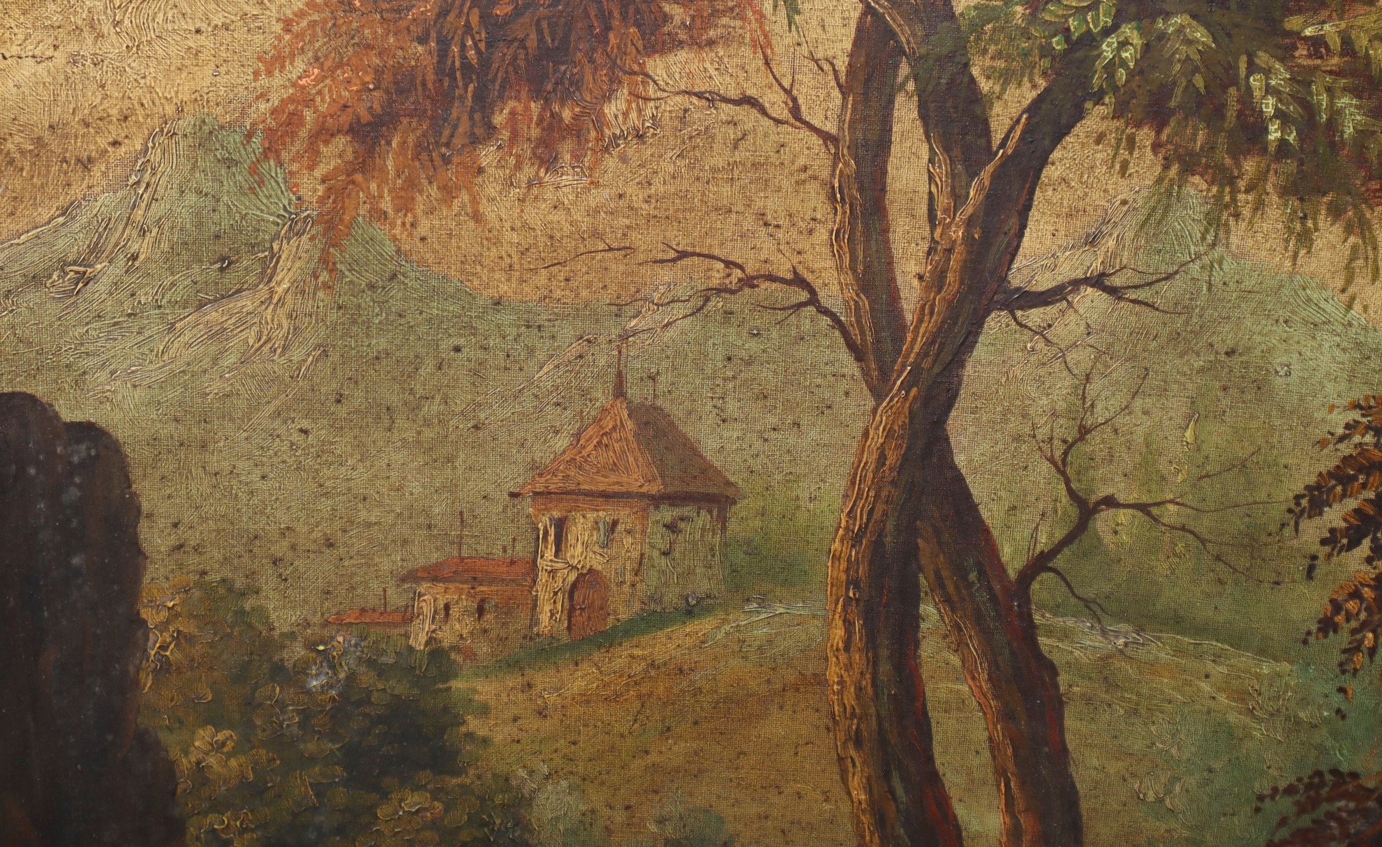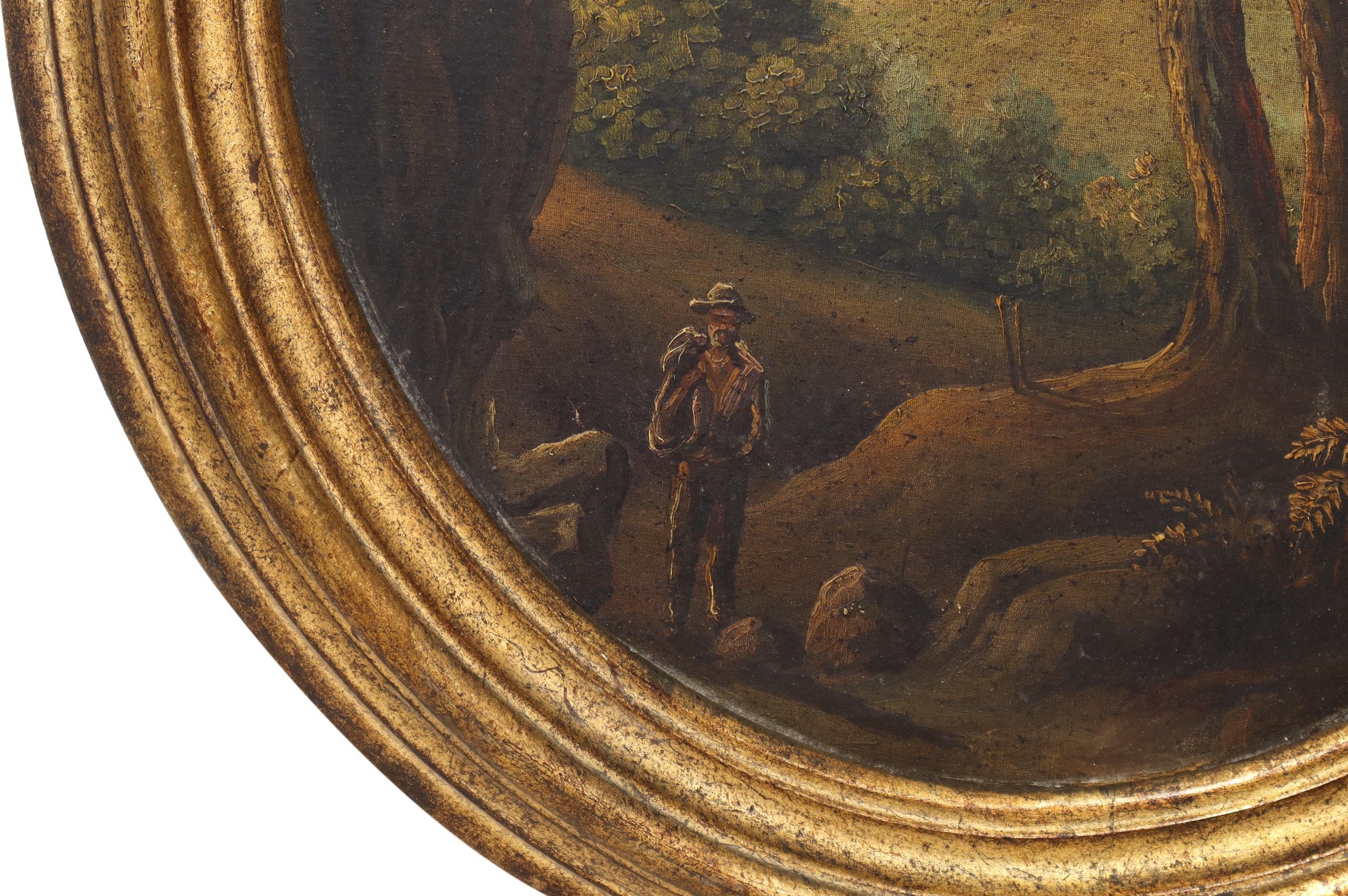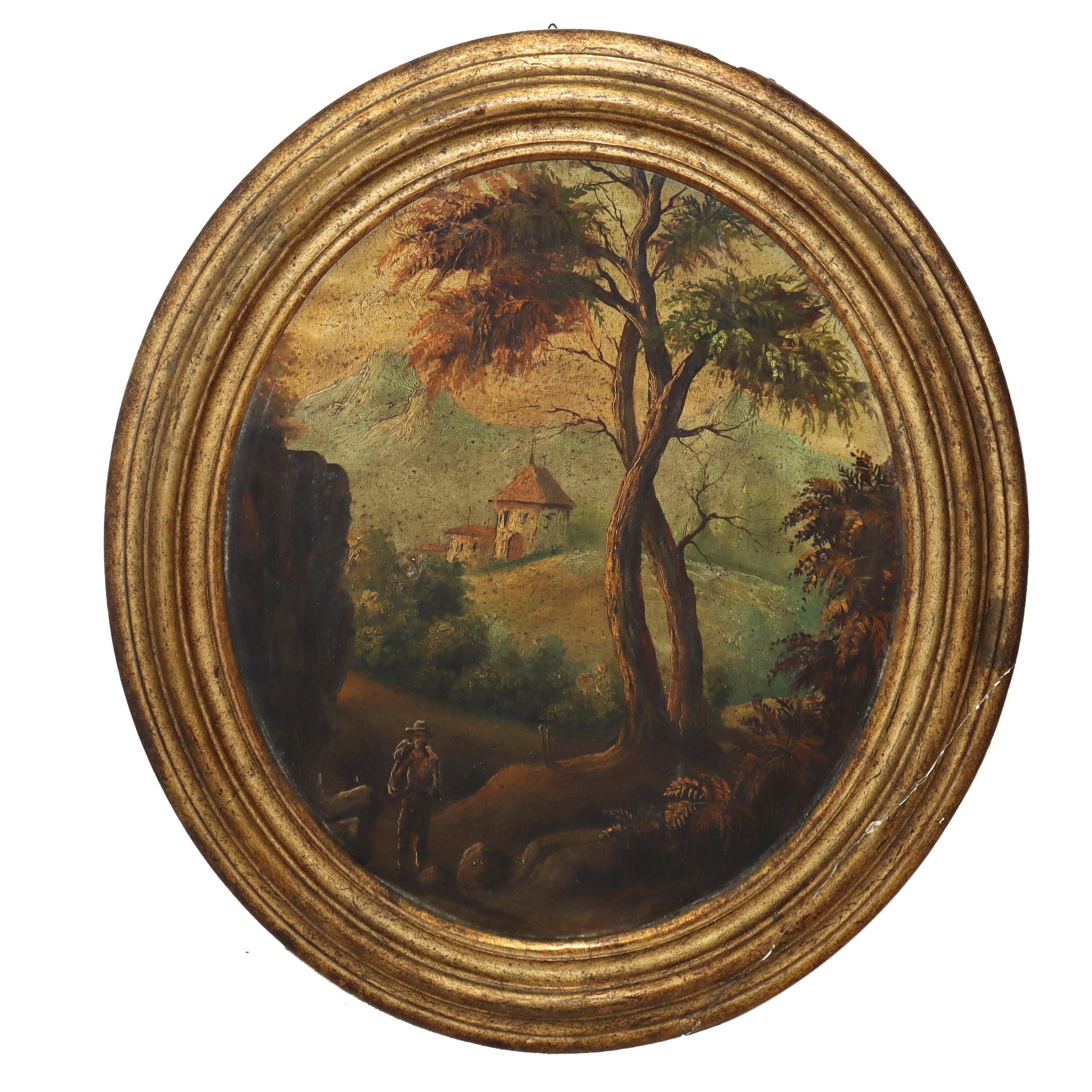 Ovale, paesaggio con albero e contadino h cm 57 x 38, in cornice 89 x 61 Olio su cartone telato