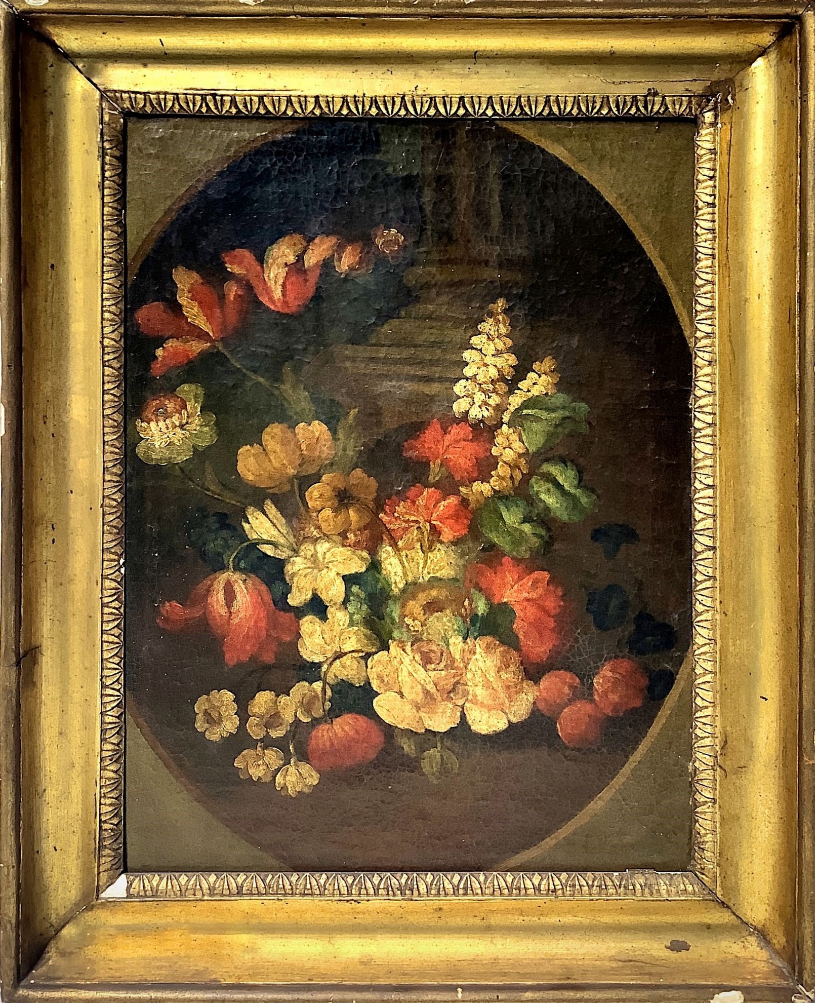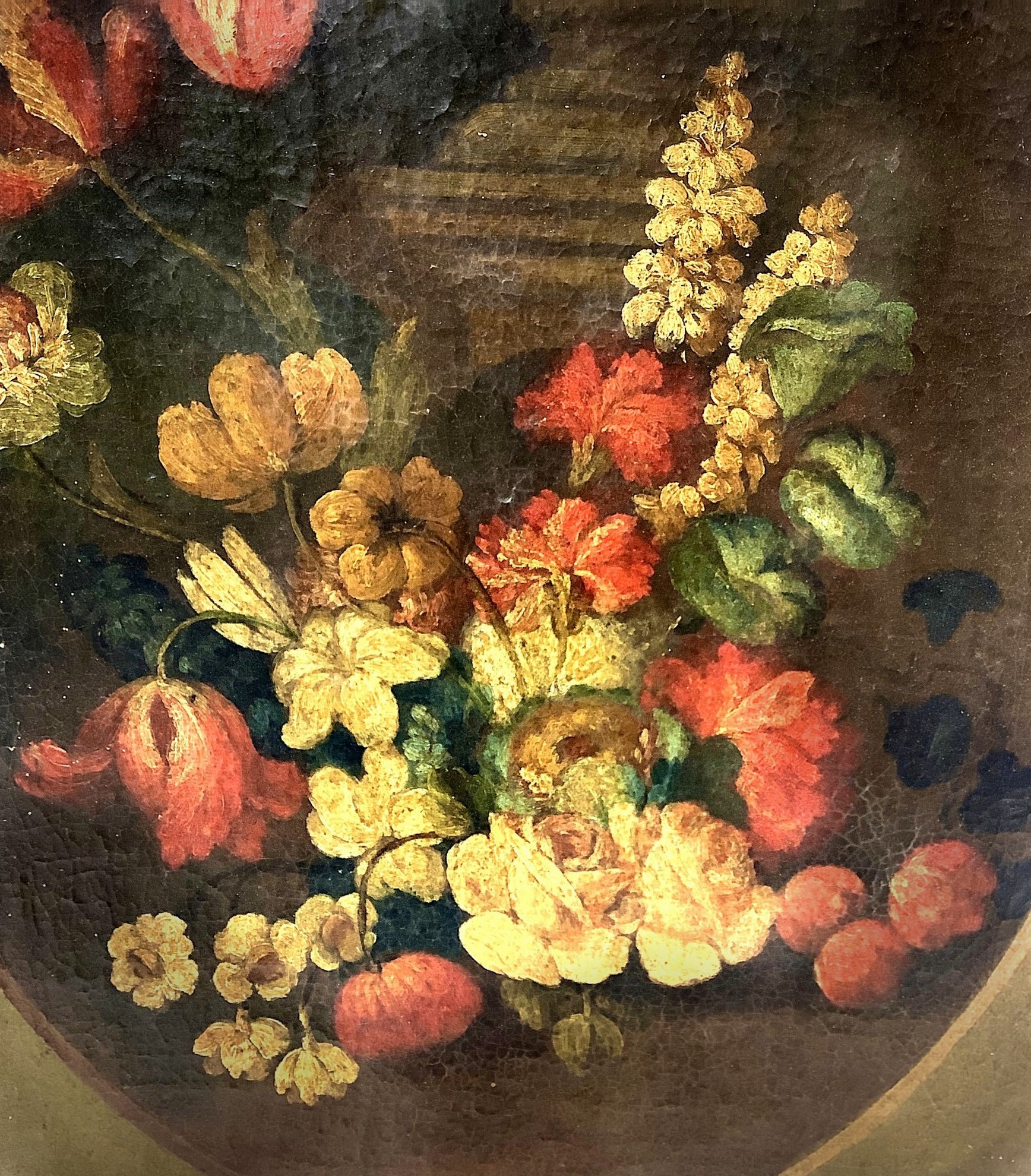 Natura morta di fiori, XVII-XVIII Secolo H cm 50x36 Olio su tela applicata su tavola Opera di pittore Italiano.