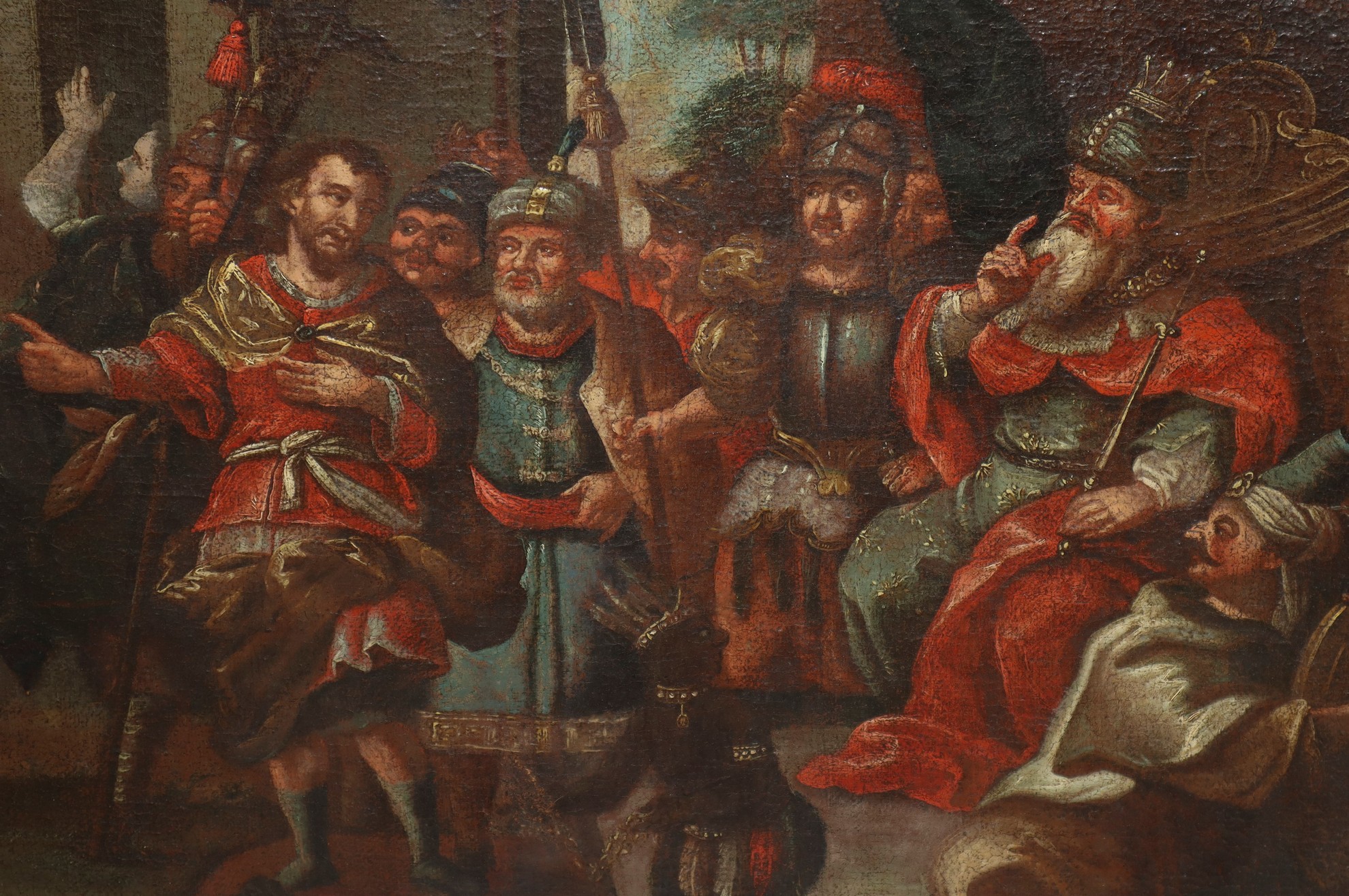 Soggetto storico con Re e personaggi, XVIII Secolo h cm 76 x 107, in cornice 90 x 120 olio su tela