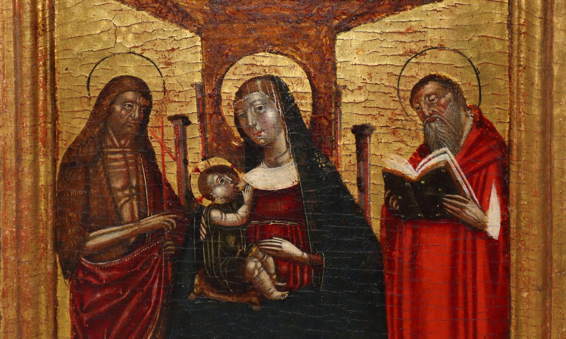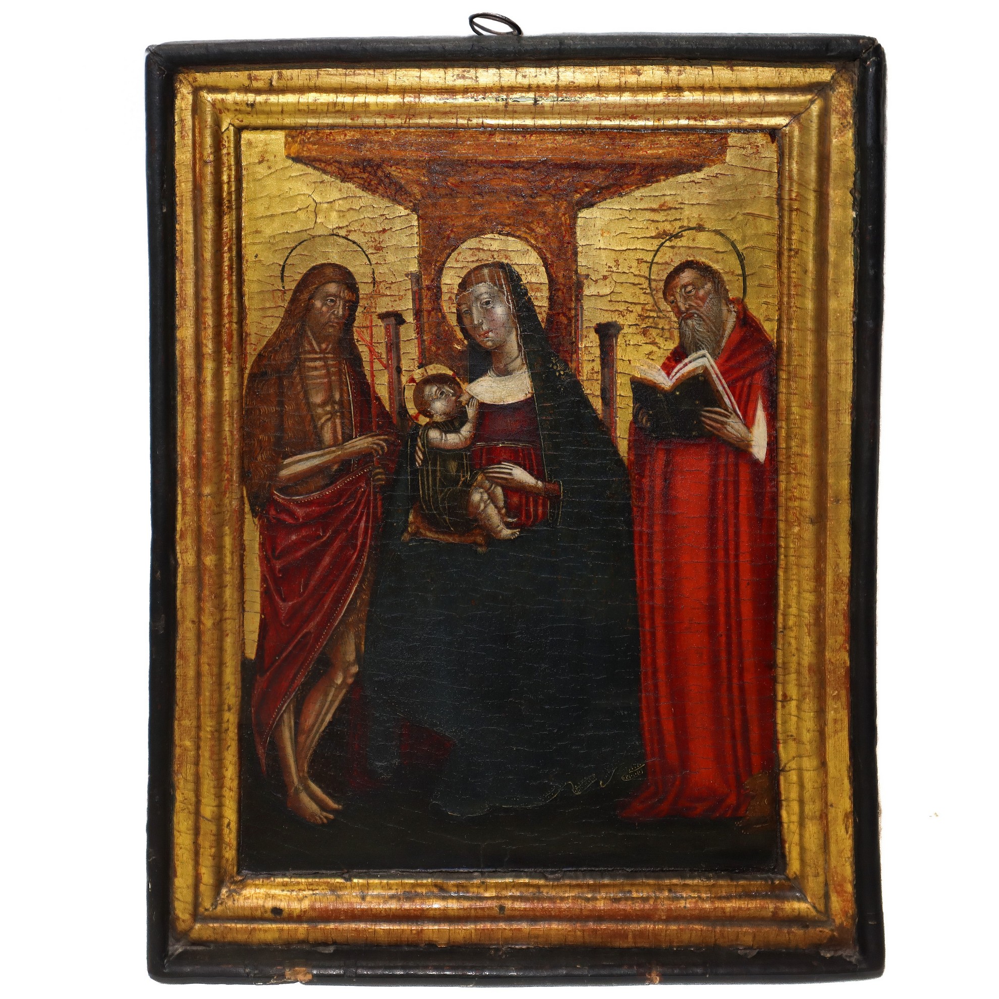 Gaspare Da Pesaro (attribuito a) (Operante a Palermo 1413-1461) - Madonna in trono col Bambino tra i SS.Giovanni e Girolamo Cm 42,5x32,5 Tempera su tavola Presente expertise del Prof. Claudio Strinati :