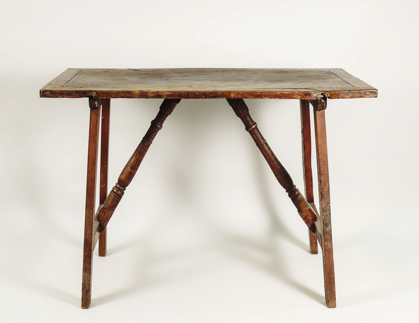 TAVOLINO RUSTICO IN NOCE - WALNUT TABLE costruito con materiale antico, gambe a capretta, traverse tornite h cm 78,5x113x55,5